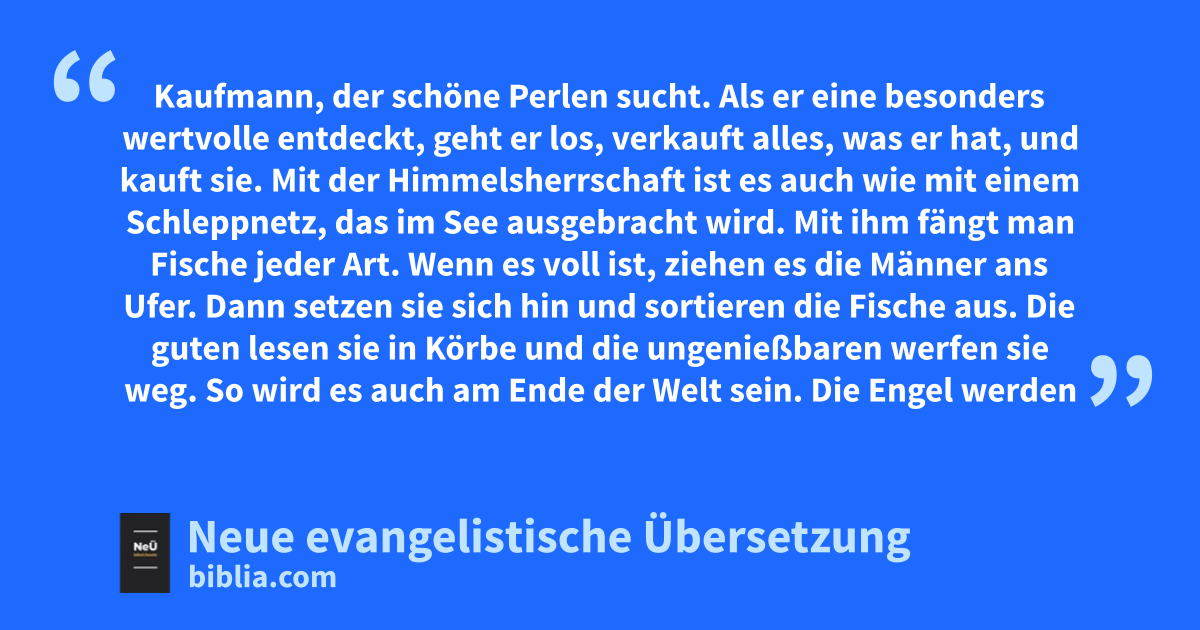 47 Mit der Himmelsherrschaft ist es auch wie mit einem Schleppnetz, das im See ausgebracht wird. Mit ihm fängt man Fische jeder Art. 48 Wenn es voll ist, ziehen es die Männer ans Ufer. Dann setzen sie sich hin und sortieren die Fische aus. Die guten lesen sie in Körbe und die ungenießbaren werfen sie weg. 49 So wird es auch am Ende der Welt sein. Die Engel werden die Menschen, die Böses getan haben, von den Gerechten trennen 50 und in den brennenden Ofen werfen. Da gibt es nur noch Weinen und Zähneknirschen.“