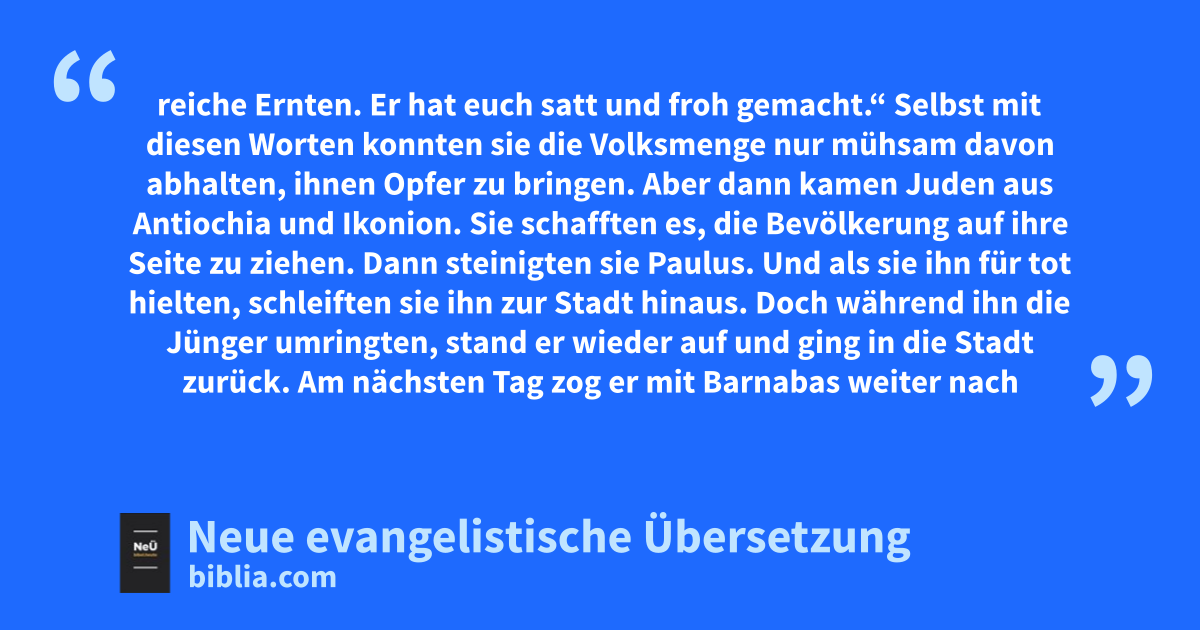 19 Aber dann kamen Juden aus Antiochia und Ikonion. Sie schafften es, die Bevölkerung auf ihre Seite zu ziehen. Dann steinigten sie Paulus. Und als sie ihn für tot hielten, schleiften sie ihn zur Stadt hinaus. 20 Doch während ihn die Jünger umringten, stand er wieder auf und ging in die Stadt zurück.
