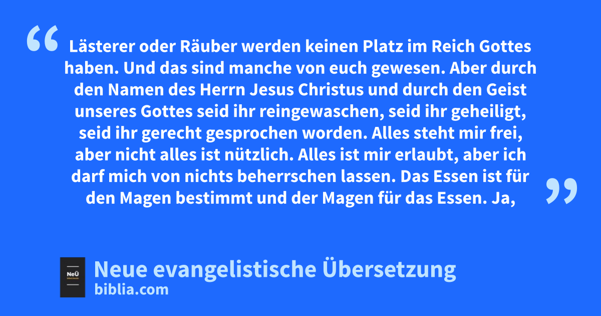 9 Wisst ihr denn nicht, dass ungerechte Menschen keinen Platz im Reich Gottes haben werden? Täuscht euch nicht: Menschen, die in sexueller Unmoral leben, die Götzen anbeten, die Ehebrecher sind oder Homosexualität praktizieren2, 10 auch Diebe oder Habsüchtige, Trinker, Lästerer oder Räuber werden keinen Platz im Reich Gottes haben. 11 Und das sind manche von euch gewesen. Aber durch den Namen des Herrn Jesus Christus und durch den Geist unseres Gottes seid ihr reingewaschen, seid ihr geheiligt, seid ihr gerecht gesprochen worden.