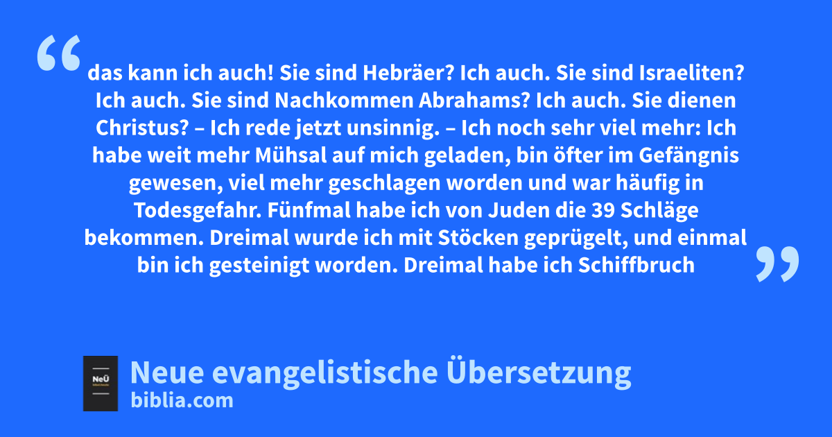 Doch wozu andere sich erdreistet haben – ich rede einmal närrisch –, das kann ich auch! 22 Sie sind Hebräer? Ich auch. Sie sind Israeliten? Ich auch. Sie sind Nachkommen Abrahams? Ich auch. 23 Sie dienen Christus? – Ich rede jetzt unsinnig. – Ich noch sehr viel mehr: Ich habe weit mehr Mühsal auf mich geladen, bin öfter im Gefängnis gewesen, viel mehr geschlagen worden und war häufig in Todesgefahr. 24 Fünfmal habe ich von Juden die 39 Schläge* bekommen. 25 Dreimal wurde ich mit Stöcken geprügelt, und einmal bin ich gesteinigt worden. Dreimal habe ich Schiffbruch erlitten. Eine Nacht und einen Tag trieb ich auf hoher See. 26 Ich habe viele Reisen gemacht und kam in Gefahr durch Flüsse und in Gefahr durch Räuber. Ich wurde bedroht durch mein eigenes Volk und durch fremde Nationen, ich geriet in Gefahr: in der Stadt, in der Wüste, auf dem Meer und auch durch falsche Brüder. 27 Wie oft ertrug ich Mühsal und Plage und durchwachte ganze Nächte; ich litt Hunger und Durst und ertrug alle möglichen Entbehrungen; ich fror und hatte nicht genug anzuziehen. 28 Und zu allem kommt noch das, was täglich auf mich eindringt: die Sorge um alle Gemeinden. 29 Wo ist jemand schwach und ich bin es nicht auch? Wo wird jemand zur Sünde verführt und es brennt nicht wie Feuer in mir? 30 Wenn schon geprahlt werden muss, dann will ich mit meiner Schwäche prahlen. 31 Gott, der Vater unseres Herrn Jesus, der in Ewigkeit gepriesen sei, er weiß, dass ich nicht lüge. 32 In Damaskus ließ der Statthalter des Königs Aretas* die Damaszenerstadt bewachen, weil er mich verhaften wollte. 33 Ich entkam ihm nur, weil ich durch ein Fenster kletterte und in einem Korb die Stadtmauer hinuntergelassen wurde.