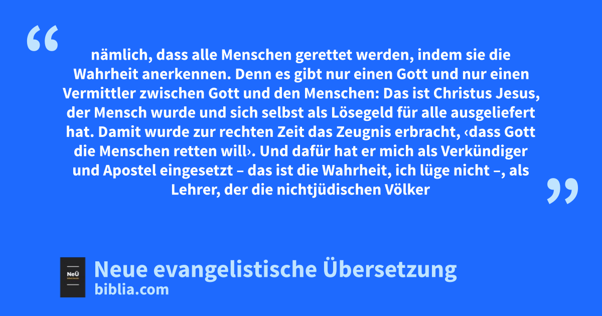 2 1 Zuallererst fordere ich euch zum Gebet für alle Menschen auf: zum Bitten und Flehen, zu Fürbitten und Danksagungen, 2 besonders für die Regierenden und alle, die Macht haben. Wir beten für sie, damit wir in Ruhe und Frieden ein Leben führen können, das Gott in jeder Hinsicht ehrt und das auch von Menschen geachtet werden kann. 3 Das ist gut, und es gefällt Gott, unserem Retter. 4 Er will nämlich, dass alle Menschen gerettet werden, indem sie die Wahrheit anerkennen. 5 Denn es gibt nur einen Gott und nur einen Vermittler zwischen Gott und den Menschen: Das ist Christus Jesus, der Mensch wurde 6 und sich selbst als Lösegeld für alle ausgeliefert hat. Damit wurde zur rechten Zeit das Zeugnis erbracht, ‹dass Gott die Menschen retten will›. 7 Und dafür hat er mich als Verkündiger und Apostel eingesetzt – das ist die Wahrheit, ich lüge nicht –, als Lehrer, der die nichtjüdischen Völker im Glauben und in der Wahrheit unterrichten soll.