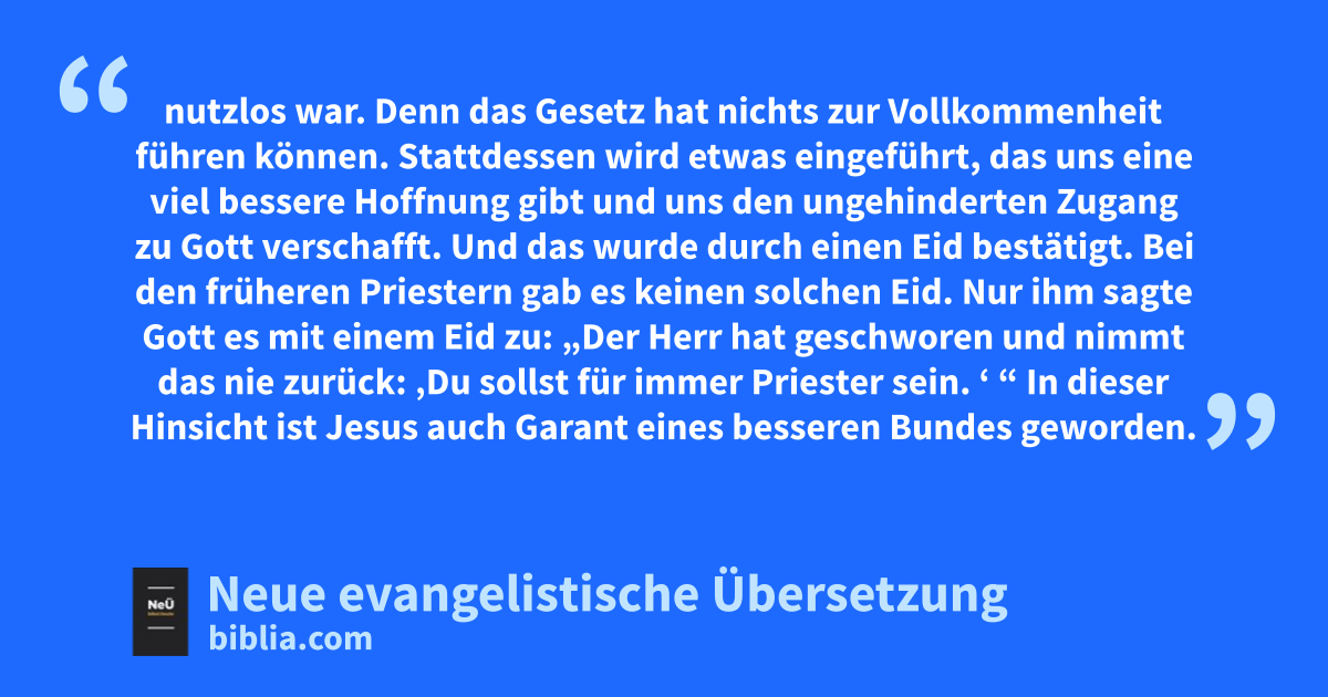 20 Und das wurde durch einen Eid bestätigt. Bei den früheren Priestern gab es keinen solchen Eid. 21 Nur ihm sagte Gott es mit einem Eid zu: „Der Herr hat geschworen und nimmt das nie zurück: ‚Du sollst für immer Priester sein. ‘ “ 2 22 In dieser Hinsicht ist Jesus auch Garant eines besseren Bundes geworden.