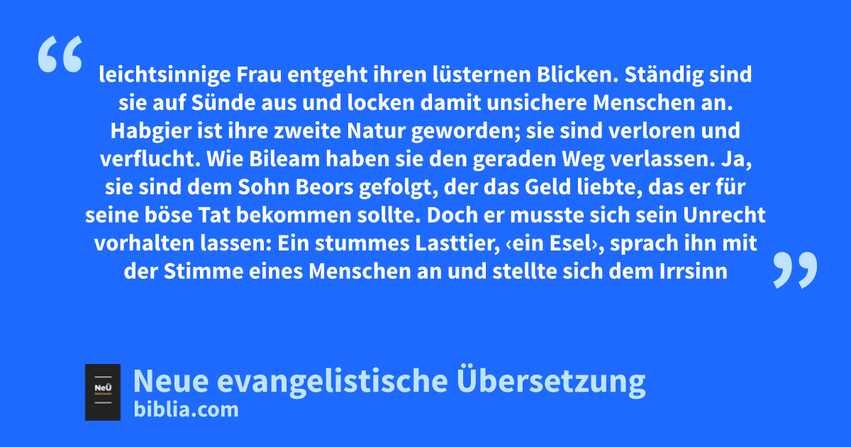 11 Das wagen nicht einmal die Engel, die doch viel stärker und mächtiger sind. Niemals würden sie solche Mächte mit ihrem Urteil vor Gott lächerlich machen. 12 Aber diese Menschen handeln wie unvernünftige Tiere, die nur geschaffen sind, um gefangen und getötet zu werden. Sie machen sich über Mächte lustig, die sie nicht einmal kennen. Ihre Verdorbenheit wird sie verderben. 13 So bekommen sie den verdienten Lohn für ihre Bosheit. Sie lieben es, schon am helllichten Tag üppige Gelage zu veranstalten. Diese Schmutz- und Schandflecken schwelgen in ihrem Betrug, und vergnügen sich mit euch zusammen beim üppigen Mahl. 14 Keine leichtsinnige Frau entgeht ihren lüsternen Blicken. Ständig sind sie auf Sünde aus und locken damit unsichere Menschen an. Habgier ist ihre zweite Natur geworden; sie sind verloren und verflucht. 15 Wie Bileam haben sie den geraden Weg verlassen. Ja, sie sind dem Sohn Beors gefolgt, der das Geld liebte, das er für seine böse Tat bekommen sollte. 16 Doch er musste sich sein Unrecht vorhalten lassen: Ein stummes Lasttier, ‹ein Esel›, sprach ihn mit der Stimme eines Menschen an und stellte sich dem Irrsinn des Propheten in den Weg. 17 Diese Menschen sind wie Brunnen, die kein Wasser haben, wie Nebelschwaden im Sturm. Sie werden in der dunkelsten Finsternis enden. 18 Mit hochtrabenden Worten reden sie nichtiges Zeug, und ziehen durch die Verlockung ihrer Ausschweifungen Menschen an, die doch gerade erst dieser Verführung entkommen sind. 19 Sie versprechen ihnen Freiheit und sind doch selber Sklaven ihrer moralischen Verkommenheit. Denn wovon man sich beherrschen lässt, von dem ist man versklavt. 20 Wenn sie nämlich vom Schmutz der Welt losgekommen sind, weil sie Jesus Christus, unseren Herrn und Retter, kennengelernt haben, sich dann aber wieder davon fangen und überwältigen lassen, dann sind sie am Ende schlimmer dran als am Anfang. 21 Dann wäre es besser für sie gewesen, sie hätten den rechten Weg nie gekannt, als ihn zu erkennen und sich dann doch von dem heiligen Gebot abzuwenden, das ihnen übergeben wurde. 22 Es ist ihnen genauso ergangen, wie das Sprichwort sagt: „Ein Hund kommt zum Erbrochenen zurück und eine gewaschene Sau wälzt sich wieder im Dreck.“2