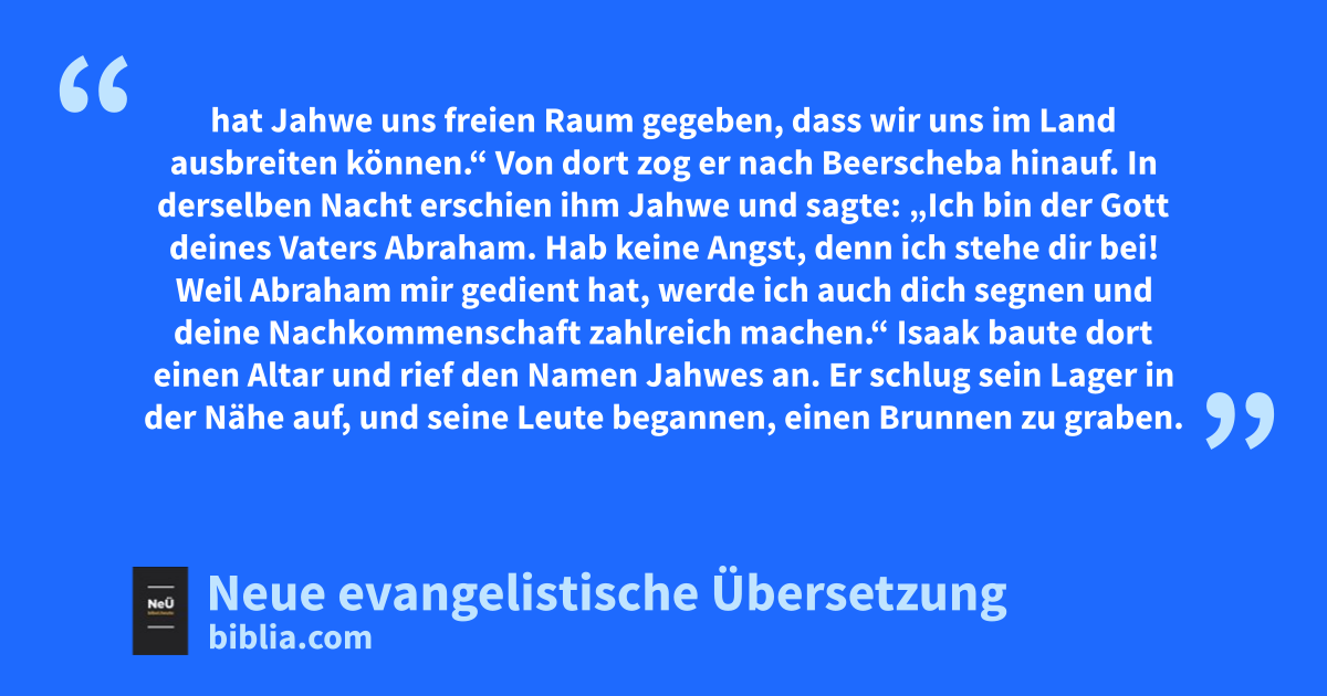 23 Von dort zog er nach Beerscheba hinauf. 24 In derselben Nacht erschien ihm Jahwe und sagte: „Ich bin der Gott deines Vaters Abraham. Hab keine Angst, denn ich stehe dir bei! Weil Abraham mir gedient hat, werde ich auch dich segnen und deine Nachkommenschaft zahlreich machen.“ 25 Isaak baute dort einen Altar und rief den Namen Jahwes an. Er schlug sein Lager in der Nähe auf, und seine Leute begannen, einen Brunnen zu graben.