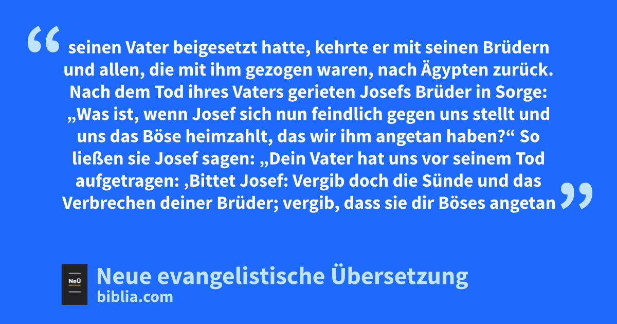 15 Nach dem Tod ihres Vaters gerieten Josefs Brüder in Sorge: „Was ist, wenn Josef sich nun feindlich gegen uns stellt und uns das Böse heimzahlt, das wir ihm angetan haben?“ 16 So ließen sie Josef sagen: „Dein Vater hat uns vor seinem Tod aufgetragen: 17 ‚Bittet Josef: Vergib doch die Sünde und das Verbrechen deiner Brüder; vergib, dass sie dir Böses angetan haben!‘ Deshalb bitten wir dich: Vergib uns das Verbrechen! Wir dienen doch demselben Gott wie unser Vater!“ Als Josef das hörte, weinte er. 18 Danach kamen die Brüder selbst zu Josef, fielen vor ihm nieder und sagten: „Wir sind deine Sklaven!“ 19 Aber Josef erwiderte: „Habt keine Angst! Bin ich denn an Gottes Stelle? 20 Ihr hattet zwar Böses mit mir vor, aber Gott hat es zum Guten gewendet, um zu erreichen, was heute geschieht: ein großes Volk am Leben zu erhalten. 21 Habt also keine Angst! Ich werde euch und eure Kinder versorgen.“ So beruhigte er sie und redete ihnen zu Herzen.