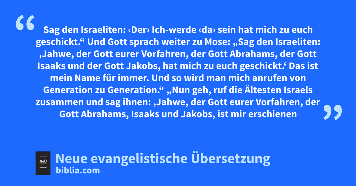 11 Mose erwiderte Gott: „Wer bin ich denn, dass ich zum Pharao gehen und die Israeliten aus Ägypten führen könnte?“ 12 „Ich werde dir ja beistehen“, sagte Gott. „Und daran wirst du erkennen, dass ich dich gesandt habe: Wenn du das Volk aus Ägypten herausgeführt hast, werdet ihr an diesem Berg Gott anbeten.“ 13 Da sagte Mose zu Gott: „Aber was ist, wenn ich zu den Israeliten komme und ihnen sage: ‚Der Gott eurer Vorfahren hat mich zu euch geschickt‘ und sie mich dann fragen: ‚Wie ist sein Name?‘ Was soll ich ihnen dann sagen?“ 14 Da sprach Gott zu Mose: „Ich werde sein, der ich bin. Sag den Israeliten: ‹Der› Ich-werde ‹da› sein hat mich zu euch geschickt.“ 15 Und Gott sprach weiter zu Mose: „Sag den Israeliten: ‚Jahwe, der Gott eurer Vorfahren, der Gott Abrahams, der Gott Isaaks und der Gott Jakobs, hat mich zu euch geschickt.‘ Das ist mein Name für immer. Und so wird man mich anrufen von Generation zu Generation.“