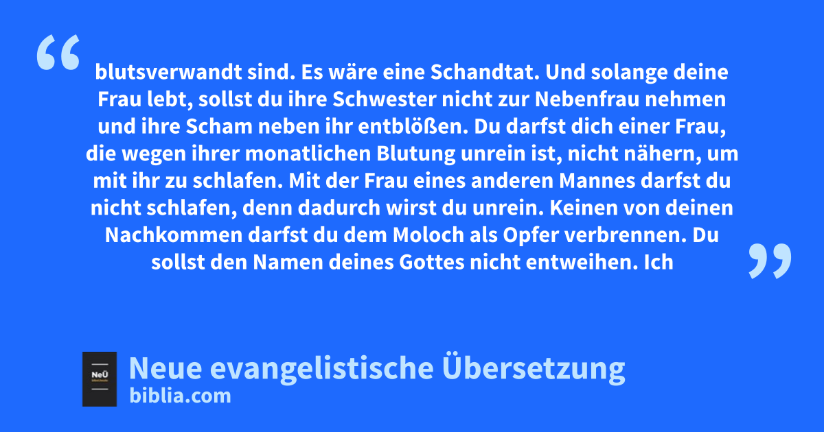 19 Du darfst dich einer Frau, die wegen ihrer monatlichen Blutung unrein ist, nicht nähern, um mit ihr zu schlafen. 20 Mit der Frau eines anderen Mannes darfst du nicht schlafen, denn dadurch wirst du unrein. 21 Keinen von deinen Nachkommen darfst du dem Moloch2 als Opfer verbrennen. Du sollst den Namen deines Gottes nicht entweihen. Ich bin Jahwe! 22 Mit einem Mann3 darfst du keinen geschlechtlichen Verkehr haben wie mit einer Frau. So etwas verabscheue ich. 23 Du darfst keinen Geschlechtsverkehr mit einem Tier haben. Dadurch verunreinigst du dich. Auch eine Frau darf sich nicht zu einem Tier stellen, um sich mit ihm zu paaren. Das ist widerwärtig.