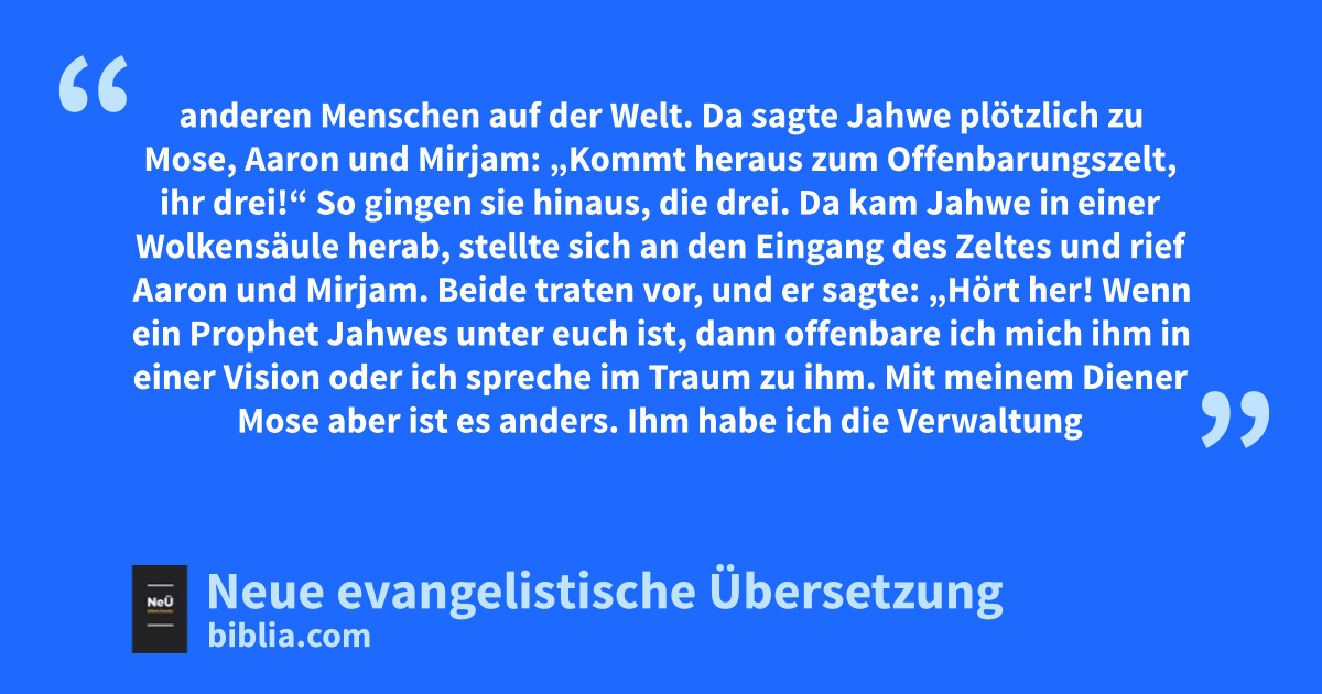 4 Da sagte Jahwe plötzlich zu Mose, Aaron und Mirjam: „Kommt heraus zum Offenbarungszelt, ihr drei!“ So gingen sie hinaus, die drei. 5 Da kam Jahwe in einer Wolkensäule herab, stellte sich an den Eingang des Zeltes und rief Aaron und Mirjam. Beide traten vor, 6 und er sagte: „Hört her! Wenn ein Prophet Jahwes unter euch ist, dann offenbare ich mich ihm in einer Vision oder ich spreche im Traum zu ihm. 7 Mit meinem Diener Mose aber ist es anders. Ihm habe ich die Verwaltung über mein ganzes Volk anvertraut. 8 Mit ihm rede ich von Mund zu Mund in klaren und eindeutigen Worten.3 Er sieht sogar Jahwes Gestalt. Wie konntet ihr es da wagen, schlecht über meinen Diener Mose zu reden?“ 9 Der Zorn Jahwes flammte gegen sie auf, und er ging weg.