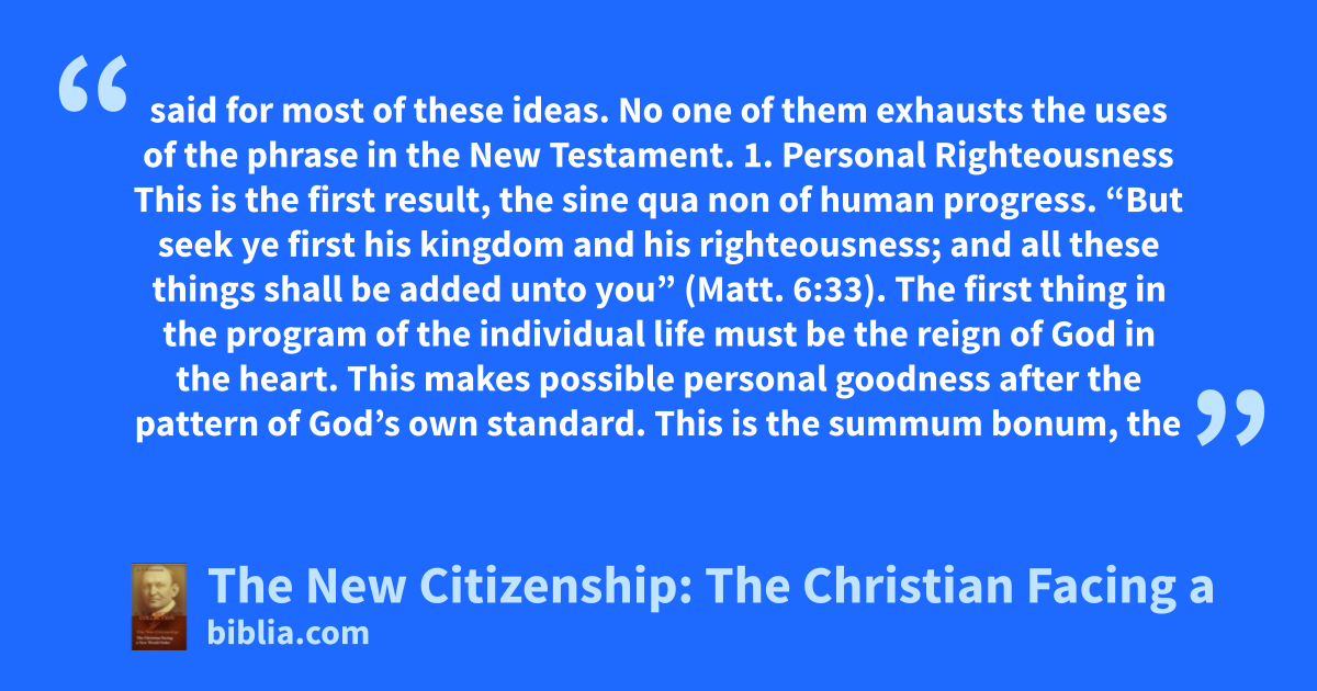 said for most of these ideas. No one of them exhausts the uses of the phrase in the New Testament. 1. Personal Righteousness This is the first result, the sine qua non of human progress. “But seek ye first his kingdom and his righteousness; and all these things shall be added unto you” (Matt. 6:33). The first thing in the program of the individual life must be the reign of God in the heart. This makes possible personal goodness after the pattern of God’s own standard. This is the summum bonum, the