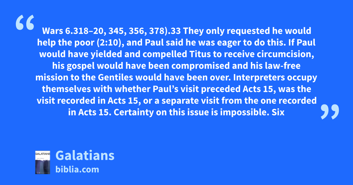 Wars 6.318–20, 345, 356, 378).33 They only requested he would help the poor (2:10), and Paul said he was eager to do this. If Paul would have yielded and compelled Titus to receive circumcision, his gospel would have been compromised and his law-free mission to the Gentiles would have been over. Interpreters occupy themselves with whether Paul’s visit preceded Acts 15, was the visit recorded in Acts 15, or a separate visit from the one recorded in Acts 15. Certainty on this issue is impossible. Six