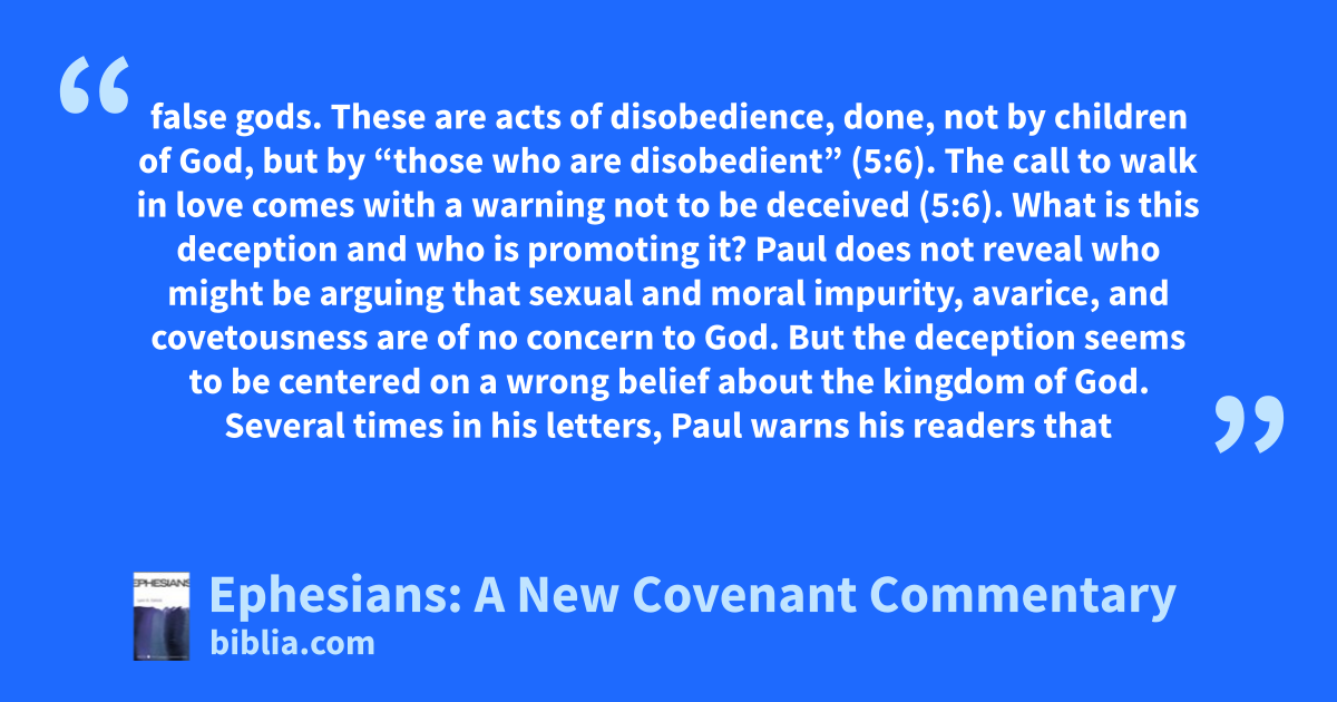 false gods. These are acts of disobedience, done, not by children of God, but by “those who are disobedient” (5:6). The call to walk in love comes with a warning not to be deceived (5:6). What is this deception and who is promoting it? Paul does not reveal who might be arguing that sexual and moral impurity, avarice, and covetousness are of no concern to God. But the deception seems to be centered on a wrong belief about the kingdom of God. Several times in his letters, Paul warns his readers that