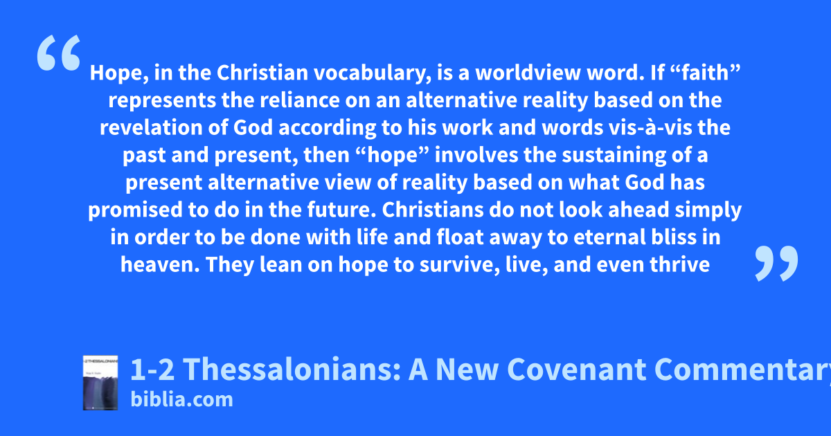 Hope, in the Christian vocabulary, is a worldview word. If “faith” represents the reliance on an alternative reality based on the revelation of God according to his work and words vis-à-vis the past and present, then “hope” involves the sustaining of a present alternative view of reality based on what God has promised to do in the future. Christians do not look ahead simply in order to be done with life and float away to eternal bliss in heaven. They lean on hope to survive, live, and even thrive