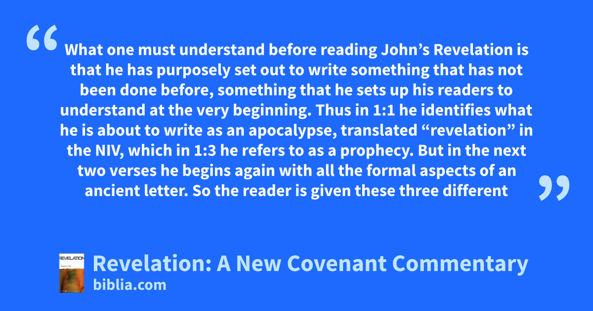 What one must understand before reading John’s Revelation is that he has purposely set out to write something that has not been done before, something that he sets up his readers to understand at the very beginning. Thus in 1:1 he identifies what he is about to write as an apocalypse, translated “revelation” in the NIV, which in 1:3 he refers to as a prophecy. But in the next two verses he begins again with all the formal aspects of an ancient letter. So the reader is given these three different