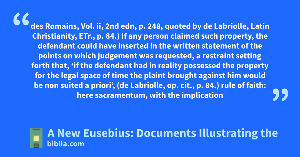 des Romains, Vol. ii, 2nd edn, p. 248, quoted by de Labriolle, Latin Christianity, ETr., p. 84.) If any person claimed such property, the defendant could have inserted in the written statement of the points on which judgement was requested, a restraint setting forth that, ‘if the defendant had in reality possessed the property for the legal space of time the plaint brought against him would be non suited a priori’, (de Labriolle, op. cit., p. 84.) rule of faith: here sacramentum, with the implication