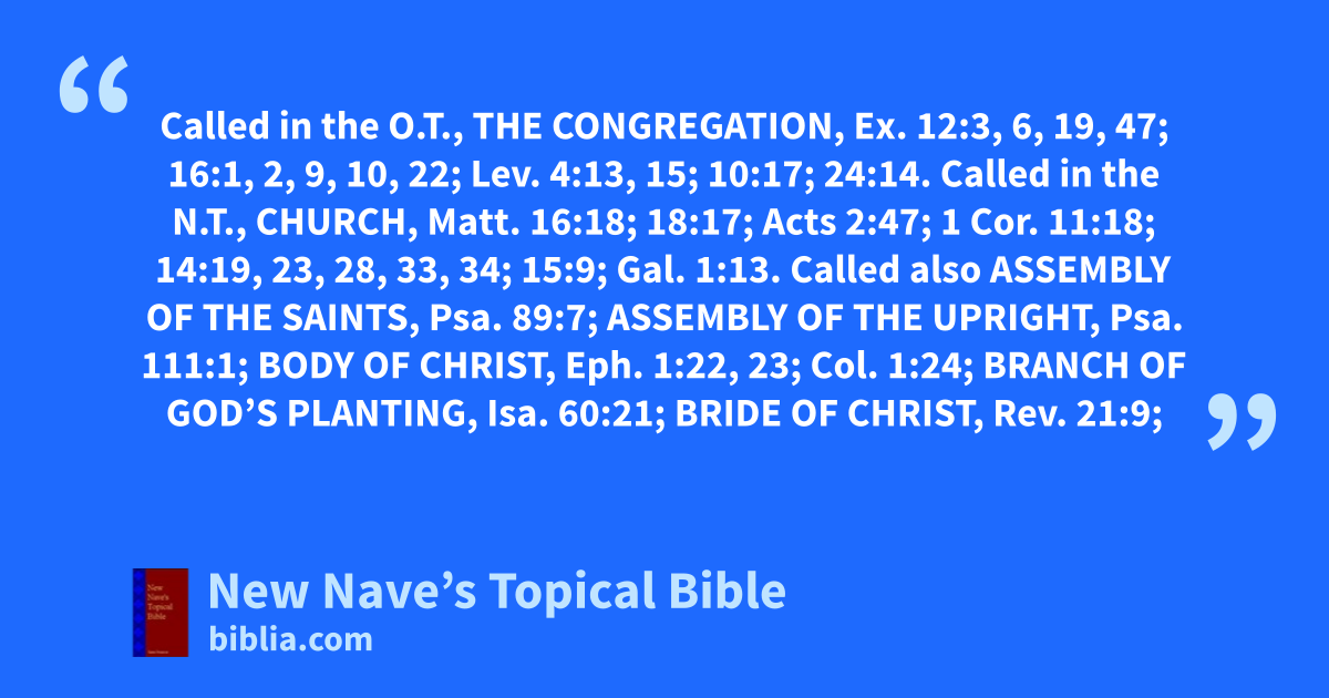 Miscellany of Minor Sub-Topics: Called in the O.T., The Congregation, Ex. 12:3, 6, 19, 47; 16:1, 2, 9, 10, 22; Lev. 4:13, 15; 10:17; 24:14. Called in the N.T., Church, Matt. 16:18; 18:17; Acts 2:47; 1 Cor. 11:18; 14:19, 23, 28, 33, 34; 15:9; Gal. 1:13. Called also Assembly of the Saints, Psa. 89:7; Assembly of the Upright, Psa. 111:1; Body of Christ, Eph. 1:22, 23; Col. 1:24; Branch of God’s Planting, Isa. 60:21; Bride of Christ, Rev. 21:9; Church of God, Acts 20:28; Church of the Living God, 1 Tim. 3:15; Church of the Firstborn, Heb. 12:23; City of the Living God, Heb. 12:22; Congregation of Saints, Psa. 149:1; Congregation of the Lord’s Poor, Psa. 74:19; Dove, Song 2:14; 5:2; Family in Heaven and Earth, Eph. 3:15; Flock of God, Ezek. 34:15; 1 Pet. 5:2; Fold of Christ, John 10:16; General Assembly of the Firstborn, Heb. 12:23; Golden Lampstand, Rev. 1:20; God’s Building, 1 Cor. 3:9; God’s Husbandry, 1 Cor. 3:9; God’s Heritage, Joel 3:2; 1 Pet. 5:3; Habitation of God, Eph. 2:22; Heavenly Jerusalem, Gal. 4:26; Heb. 12:22; Holy City, Rev. 21:2; Holy Mountain, Zech. 8:3; Holy Hill, Psa. 2:6; 15:1; House of God, 1 Tim. 3:15; Heb. 10:21; The God of Jacob, Isa. 2:3; House of Christ, Heb. 3:6; Household of God, Eph. 2:19; Inheritance, Psa. 28:9; Isa. 19:25; Israel of God, Gal. 6:16; King’s Daughter, Psa. 45:13; Kingdom of God, Matt. 6:33; 12:28; 19:24; 21:31; Kingdom of Heaven, Matt. 3:2; 4:17; 10:7; 5:3, 10, 19, 20; His Kingdom, Psa. 103:19; 145:12; Matt. 16:28; Luke 1:33; My Kingdom, John 18:36; Your Kingdom, Psa. 45:6; 145:11, 13; Matt. 6:10; Luke 23:43; Lamb’s Bride, Eph. 5:22–32; Rev. 22:17; Lamb’s Wife, Rev. 19:7–9; 21:9; Lot of God’s Inheritance, Deut. 32:9; Mount Zion, Heb. 12:22; Mountain of the Lord’s House, Isa. 2:2; New Jerusalem, Rev. 21:2; Pillar and Ground of the Truth, 1 Tim. 3:15; Place of God’s Throne, Ezek. 43:7; Pleasant Portion, Jer. 12:10; Sanctuary of God, Psa. 114:2; Sister of Christ, Song 4:12; 5:2; Spiritual House, 1 Pet. 2:5; Spouse of Christ, Song 4:12; 5:1; Strength and Glory of God, Psa. 78:61; Sought Out, A City Not Forsaken, Isa. 62:12; The Lord’s Portion, Deut. 32:9; Temple of God, 1 Cor. 3:16, 17; Temple of the Living God, 2 Cor. 6:16; Vineyard, Jer. 12:10; Matt. 21:41. Christ’s love for, John 10:8, 11, 12; Eph. 5:25–32; Rev. 3:9. Loved by believers, Psa. 87:7; 137:5; 1 Cor. 12:25; 1 Thess. 4:9; is prayed for, Psa. 122:6; Isa. 62:6; dear to God, Isa. 43:4; safe under his care, Psa. 46:1, 2, 5; salt and light of the world, Matt. 5:13. Militant, Song 6:10; Phil. 2:24; 2 Tim. 2:3; 4:7; Philem. 2. God defends, Psa. 89:18; Isa. 4:5; 49:25; Matt. 16:18. God provides ministers for, Jer. 3:15; Eph. 4:11, 12. Is glorious, Psa. 45:13; Eph. 5:27. Is clothed in righteousness, Rev. 19:8. Believers continually added to, by the Lord, Acts 2:47; 5:14; 11:24. Unity of, Rom. 12:5; 1 Cor. 10:17; 12:12; Gal. 3:28; Eph. 4:4. Privileges of, Psa. 36:8; 87:5. Worship of, to be attended, Heb. 10:25. Harmonious fellowship of, Psa. 133; John 13:34; Acts 4:32; Phil. 1:4; 2:1; 1 John 3, 4. Divisions in, to be shunned, Rom. 16:17; 1 Cor. 1:10; 3:3. Baptized into by one Spirit, 1 Cor. 12:13. Ministers commanded to feed, Acts 20:28. Is edified by the word, Rom. 12:6; 1 Cor. 14:4, 13; Eph. 4:15, 16; Col. 3:16. The wicked persecute, Acts 8:1–3; 1 Thess. 2:14, 15. Not to be despised, 1 Cor. 11:22. Defiling of, will be punished, 1 Cor. 3:17. Extent of, predicted, Isa. 2:2; Ezek. 17:22–24; Dan. 2:34, 35. See Ecclesiasticism; Jesus, King of; Ministers; Usurpation, In Ecclesiastical Affairs.