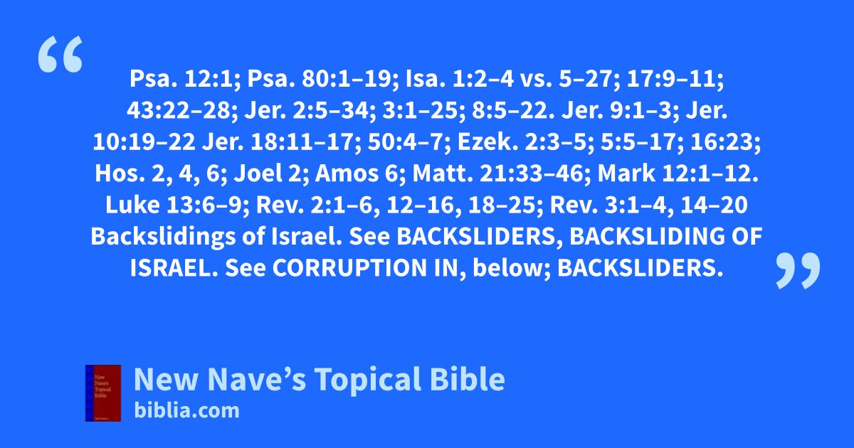 Backslidden: Psa. 12:1; Psa. 80:1–19; Isa. 1:2–4 vs. 5–27; 17:9–11; 43:22–28; Jer. 2:5–34; 3:1–25; 8:5–22. Jer. 9:1–3; Jer. 10:19–22 Jer. 18:11–17; 50:4–7; Ezek. 2:3–5; 5:5–17; 16:23; Hos. 2, 4, 6; Joel 2; Amos 6; Matt. 21:33–46; Mark 12:1–12. Luke 13:6–9; Rev. 2:1–6, 12–16, 18–25; Rev. 3:1–4, 14–20 Backslidings of Israel. See Backsliders, Backsliding of Israel. See Corruption in, below; Backsliders.