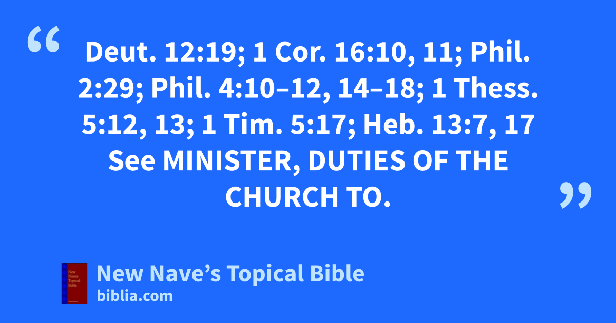 Duty of, To Ministers: Deut. 12:19; 1 Cor. 16:10, 11; Phil. 2:29; Phil. 4:10–12, 14–18; 1 Thess. 5:12, 13; 1 Tim. 5:17; Heb. 13:7, 17 See Minister, Duties of the church to.