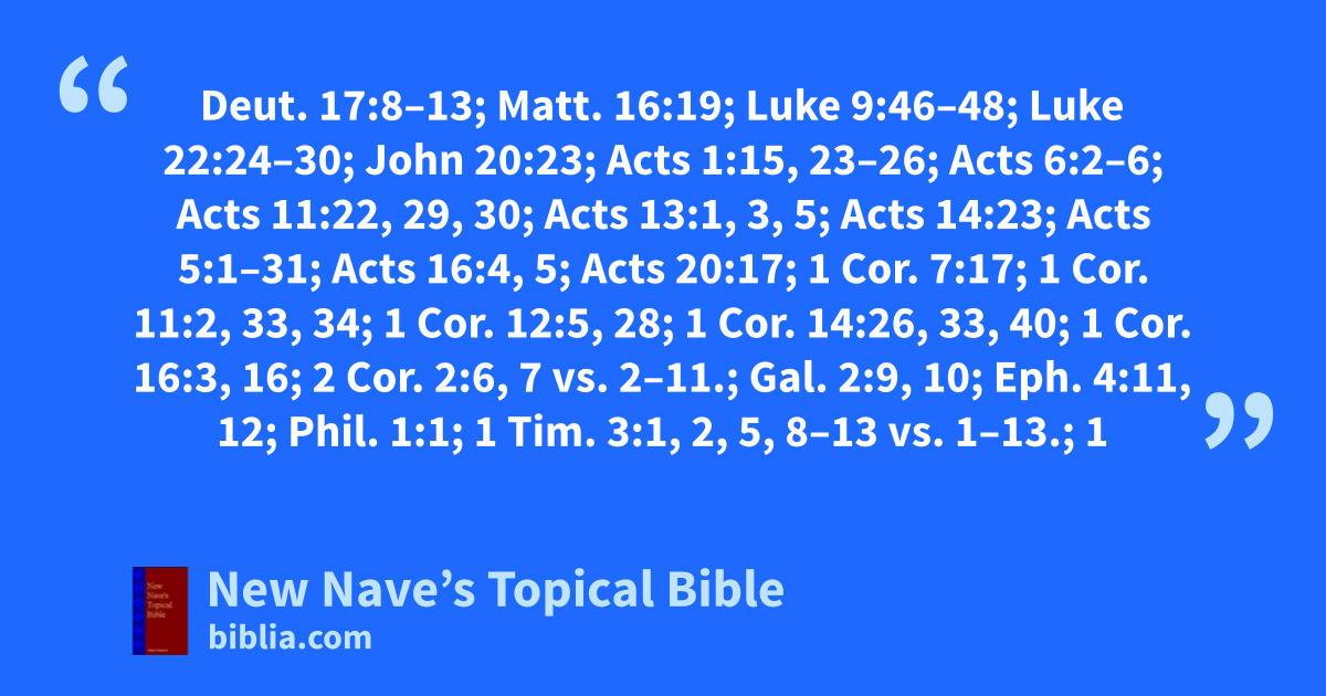 Government of, Mosaic and Christian: Deut. 17:8–13; Matt. 16:19; Luke 9:46–48; Luke 22:24–30; John 20:23; Acts 1:15, 23–26; Acts 6:2–6; Acts 11:22, 29, 30; Acts 13:1, 3, 5; Acts 14:23; Acts 5:1–31; Acts 16:4, 5; Acts 20:17; 1 Cor. 7:17; 1 Cor. 11:2, 33, 34; 1 Cor. 12:5, 28; 1 Cor. 14:26, 33, 40; 1 Cor. 16:3, 16; 2 Cor. 2:6, 7 vs. 2–11.; Gal. 2:9, 10; Eph. 4:11, 12; Phil. 1:1; 1 Tim. 3:1, 2, 5, 8–13 vs. 1–13.; 1 Tim. 4:14; 1 Tim. 5:1, 17, 22; 2 Tim. 1:6; Tit. 1:5; Heb. 13:17, 24; Jas. 5:14, 15; 1 Pet. 5:1–3; 3 John 9, 10; Jude 22, 23 See Minister, Duties of.