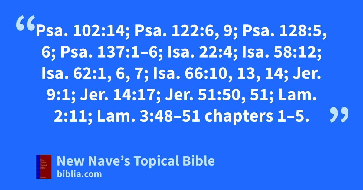 Love for: Psa. 102:14; Psa. 122:6, 9; Psa. 128:5, 6; Psa. 137:1–6; Isa. 22:4; Isa. 58:12; Isa. 62:1, 6, 7; Isa. 66:10, 13, 14; Jer. 9:1; Jer. 14:17; Jer. 51:50, 51; Lam. 2:11; Lam. 3:48–51 chapters 1–5.