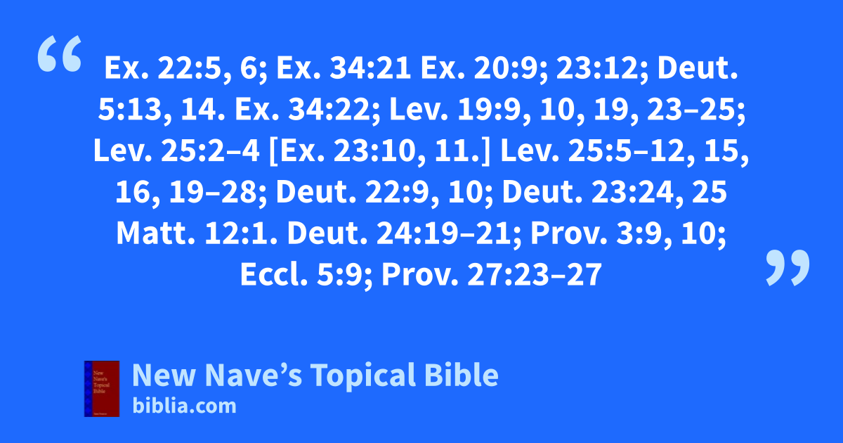Laws Concerning: Ex. 22:5, 6; Ex. 34:21 Ex. 20:9; 23:12; Deut. 5:13, 14. Ex. 34:22; Lev. 19:9, 10, 19, 23–25; Lev. 25:2–4 [Ex. 23:10, 11.] Lev. 25:5–12, 15, 16, 19–28; Deut. 22:9, 10; Deut. 23:24, 25 Matt. 12:1. Deut. 24:19–21; Prov. 3:9, 10; Eccl. 5:9; Prov. 27:23–27