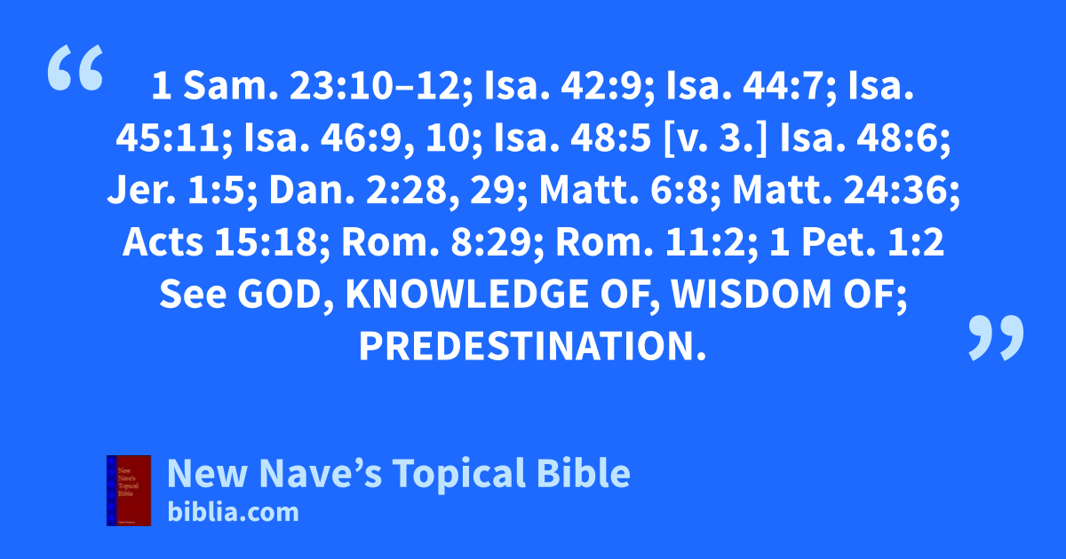 Foreknowledge of: 1 Sam. 23:10–12; Isa. 42:9; Isa. 44:7; Isa. 45:11; Isa. 46:9, 10; Isa. 48:5 [v. 3.] Isa. 48:6; Jer. 1:5; Dan. 2:28, 29; Matt. 6:8; Matt. 24:36; Acts 15:18; Rom. 8:29; Rom. 11:2; 1 Pet. 1:2 See God, Knowledge of, Wisdom of; Predestination.