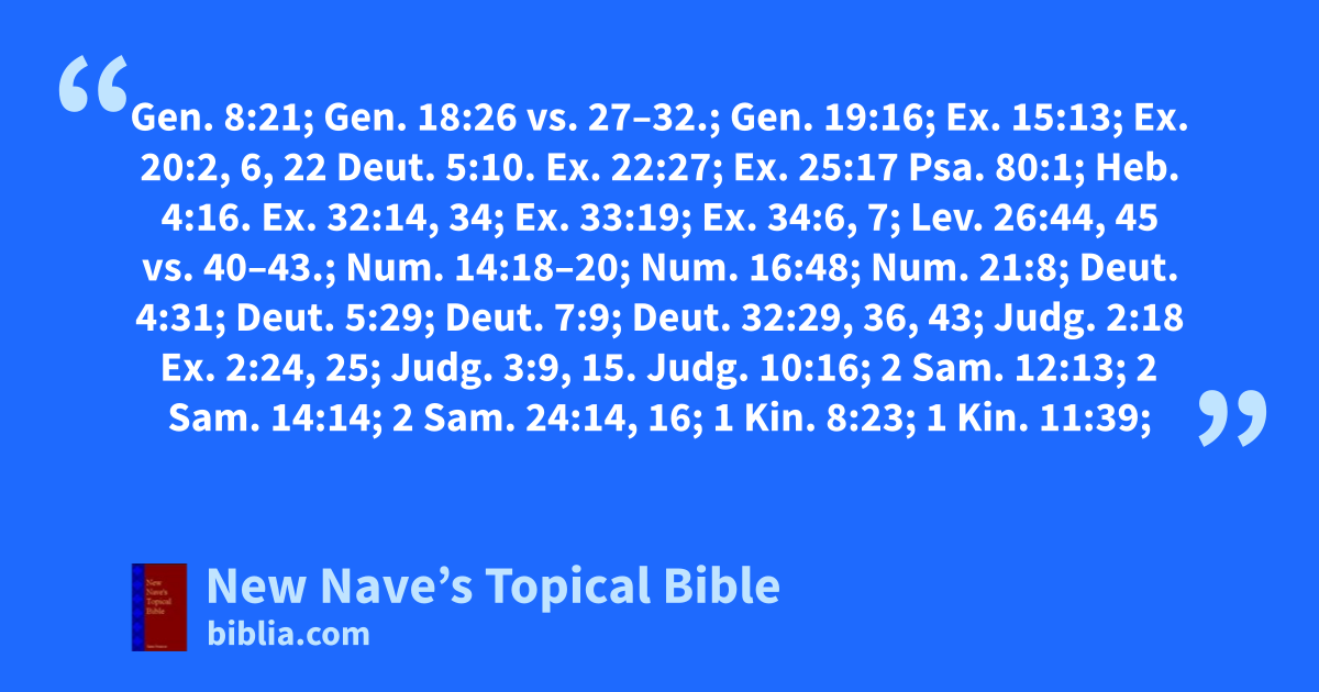 Mercy of: Gen. 8:21; Gen. 18:26 vs. 27–32.; Gen. 19:16; Ex. 15:13; Ex. 20:2, 6, 22 Deut. 5:10. Ex. 22:27; Ex. 25:17 Psa. 80:1; Heb. 4:16. Ex. 32:14, 34; Ex. 33:19; Ex. 34:6, 7; Lev. 26:44, 45 vs. 40–43.; Num. 14:18–20; Num. 16:48; Num. 21:8; Deut. 4:31; Deut. 5:29; Deut. 7:9; Deut. 32:29, 36, 43; Judg. 2:18 Ex. 2:24, 25; Judg. 3:9, 15. Judg. 10:16; 2 Sam. 12:13; 2 Sam. 14:14; 2 Sam. 24:14, 16; 1 Kin. 8:23; 1 Kin. 11:39; 2 Kin. 13:23; 2 Kin. 14:26, 27; 1 Chr. 16:34; 2 Chr. 5:13; 2 Chr. 7:3, 6, 14; 2 Chr. 30:9; 2 Chr. 36:15 Jer. 7:25. Ezra 9:9, 13 vs. 7–14; Job 11:6. Neh. 1:10; Neh. 9:17, 27–31 vs. 17–20; 2 Chr. 24:19. Job 23:2–6; Job 24:12; Job 33:14–30; Psa. 18:50; Psa. 25:6, 8; Psa. 30:5; Psa. 31:7; Psa. 32:1, 2, 5; Psa. 36:5; Psa. 50:21; Psa. 57:10; Psa. 62:12; Psa. 65:3; Psa. 69:16; Psa. 78:38, 39 vs. 4–72; Psa. 106:43–46. Psa. 85:2, 3, 10; Psa. 86:5, 13, 15; Psa. 89:2, 14, 28; Psa. 99:8; Psa. 100:5; Psa. 103:3, 8–14, 17; Psa. 106:1 Psa. 107:1; 136:3–26. Psa. 108:4; Psa. 111:4; Psa. 116:5; Psa. 117:2 Psa. 118:1–4, 29. Psa. 119:64, 156; Psa. 130:3, 4, 7, 8; Psa. 135:14; Psa. 138:2; Psa. 145:8, 9; Psa. 146:7, 8; Prov. 16:6; Prov. 28:13; Isa. 1:5, 18; Isa. 6:7; Isa. 12:1; Isa. 17:6 Isa. 24:13. Isa. 54:9; Isa. 55:7–9; Isa. 57:11, 15, 16, 18, 19; Isa. 60:10; Isa. 65:2, 8; Jer. 2:9; Jer. 3:12, 22 vs. 1–22.; Jer. 4:27; Jer. 5:10; Jer. 9:24; Jer. 29:11; Jer. 30:11 Jer. 46:28. Jer. 31:20, 34, 37; Jer. 32:18; Jer. 33:8, 11; Jer. 36:3 vs. 6, 7.; Jer. 50:20; Jer. 51:5; Lam. 3:22, 23, 31, 32, 33; Ezek. 14:22; Ezek. 16:6, 42, 63; Ezek. 18:23, 31, 32; Ezek. 20:17, 42 vs. 11–44.; Ezek. 33:11; Ezek. 36:25; Dan. 4:22–27; Dan. 9:4, 9; Hos. 2:14, 23 vs. 14–23; Rom. 9:15, 18; 1 Pet. 2:10. Hos. 11:8, 9; Hos. 14:4 vs. 1–8.; Joel 2:13, 18; Joel 3:21; Amos 7:3; Jonah 4:2, 10, 11; Mic. 7:18, 19; Nah. 1:3; Zeph. 2:7; Zech. 1:16, 17; Zech. 3:9; Zech. 10:6; Mal. 3:6; Matt. 6:14; Matt. 18:11–14, 23–27 Luke 15:4–7. Luke 1:50, 77, 78; Luke 6:36; Acts 3:19; Acts 17:30; Acts 26:18; Rom. 10:12, 13; Rom. 11:32; Rom. 15:9; 1 Cor. 15:10; 2 Cor. 1:3; 2 Cor. 4:15; 2 Cor. 12:9; Eph. 1:6–8; Eph. 2:4–7; 1 Tim. 1:13; Tit. 3:5; Heb. 4:16; Heb. 8:12; Jas. 2:13; Jas. 4:8; Jas. 5:11, 15; 1 Pet. 1:3; 1 Pet. 5:10; 2 Pet. 3:9, 15; 1 John 1:9; Rev. 2:21 See Longsuffering of, Love of.
