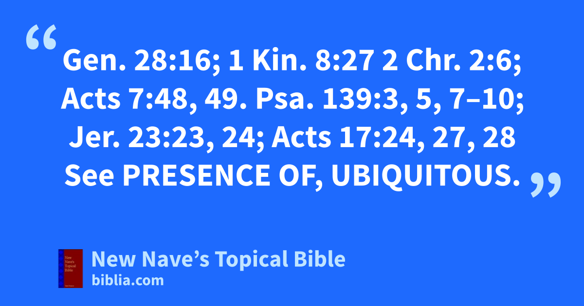 Omnipresent: Gen. 28:16; 1 Kin. 8:27 2 Chr. 2:6; Acts 7:48, 49. Psa. 139:3, 5, 7–10; Jer. 23:23, 24; Acts 17:24, 27, 28 See Presence of, Ubiquitous.