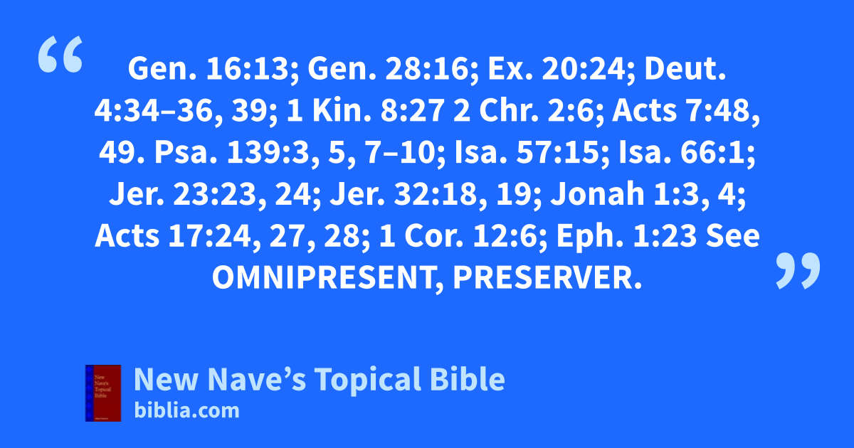 Presence of: Gen. 16:13; Gen. 28:16; Ex. 20:24; Deut. 4:34–36, 39; 1 Kin. 8:27 2 Chr. 2:6; Acts 7:48, 49. Psa. 139:3, 5, 7–10; Isa. 57:15; Isa. 66:1; Jer. 23:23, 24; Jer. 32:18, 19; Jonah 1:3, 4; Acts 17:24, 27, 28; 1 Cor. 12:6; Eph. 1:23 See Omnipresent, Preserver.