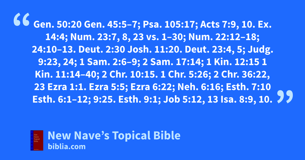 Providence of, Overruling Interpositions of the: Gen. 50:20 Gen. 45:5–7; Psa. 105:17; Acts 7:9, 10. Ex. 14:4; Num. 23:7, 8, 23 vs. 1–30; Num. 22:12–18; 24:10–13. Deut. 2:30 Josh. 11:20. Deut. 23:4, 5; Judg. 9:23, 24; 1 Sam. 2:6–9; 2 Sam. 17:14; 1 Kin. 12:15 1 Kin. 11:14–40; 2 Chr. 10:15. 1 Chr. 5:26; 2 Chr. 36:22, 23 Ezra 1:1. Ezra 5:5; Ezra 6:22; Neh. 6:16; Esth. 7:10 Esth. 6:1–12; 9:25. Esth. 9:1; Job 5:12, 13 Isa. 8:9, 10. Psa. 17:13, 14; Psa. 33:10; Psa. 75:7; Psa. 76:10; Psa. 127:1, 2; Prov. 13:22; Prov. 14:19; Prov. 16:7, 33; Prov. 19:21; Prov. 21:1, 18; Prov. 28:8; Eccl. 2:26; Eccl. 3:1, 10; Isa. 10:5–7; Isa. 13:3–5; Isa. 41:2, 4; Isa. 43:14; Isa. 44:28; Isa. 45:5, 6, 13 vs. 1–5.; Isa. 48:14, 15; Isa. 54:16, 17; Jer. 51:20, 21; Jer. 52:3; Ezek. 21:26, 27; Ezek. 29:19, 20; Dan. 11:27; Acts 3:17, 18; Acts 5:38, 39; Rom. 1:10; Rom. 8:28; 1 Cor. 4:19; 1 Cor. 16:7; Phil. 1:12, 19; Philem. 15; Jas. 4:15; Rev. 17:17 See Goodness of, Preserver.