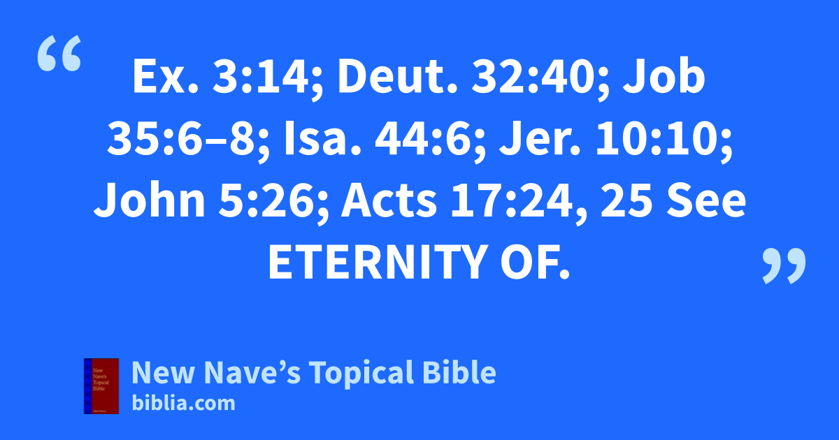 Self-existence: Ex. 3:14; Deut. 32:40; Job 35:6–8; Isa. 44:6; Jer. 10:10; John 5:26; Acts 17:24, 25 See Eternity of.