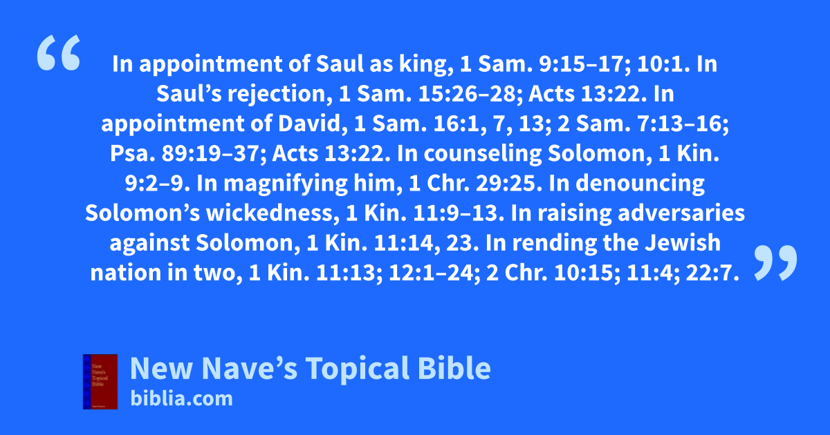 God in: In appointment of Saul as king, 1 Sam. 9:15–17; 10:1. In Saul’s rejection, 1 Sam. 15:26–28; Acts 13:22. In appointment of David, 1 Sam. 16:1, 7, 13; 2 Sam. 7:13–16; Psa. 89:19–37; Acts 13:22. In counseling Solomon, 1 Kin. 9:2–9. In magnifying him, 1 Chr. 29:25. In denouncing Solomon’s wickedness, 1 Kin. 11:9–13. In raising adversaries against Solomon, 1 Kin. 11:14, 23. In rending the Jewish nation in two, 1 Kin. 11:13; 12:1–24; 2 Chr. 10:15; 11:4; 22:7. In blotting out the house of Jeroboam, 1 Kin. 14:7–16; 15:27–30. In appointment of kings, 1 Kin. 14:14; 16:1–4; 1 Chr. 28:4, 5; 29:25; Psa. 22:28; Prov. 8:15, 16; Dan. 2:20, 21, 37; 5:20–24. In destruction of nations, Amos 9:8. See Theocratic, above. Also see God, Sovereign.