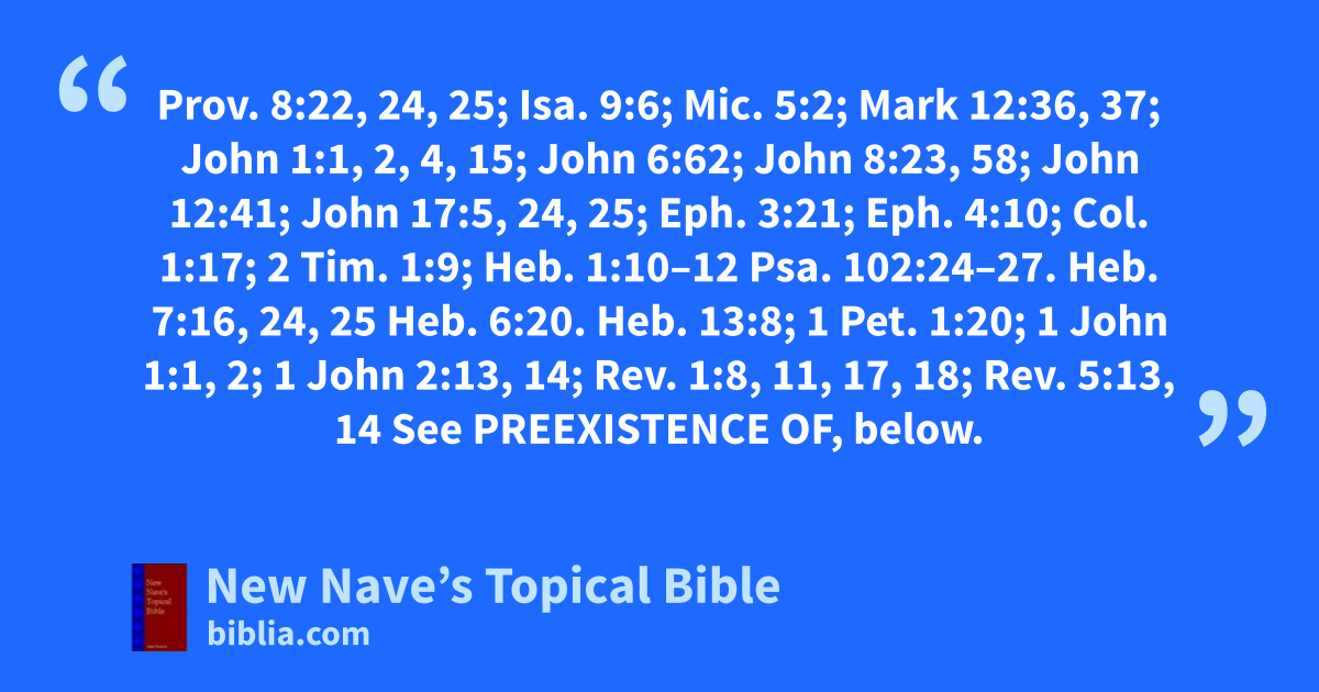 Eternity of: Prov. 8:22, 24, 25; Isa. 9:6; Mic. 5:2; Mark 12:36, 37; John 1:1, 2, 4, 15; John 6:62; John 8:23, 58; John 12:41; John 17:5, 24, 25; Eph. 3:21; Eph. 4:10; Col. 1:17; 2 Tim. 1:9; Heb. 1:10–12 Psa. 102:24–27. Heb. 7:16, 24, 25 Heb. 6:20. Heb. 13:8; 1 Pet. 1:20; 1 John 1:1, 2; 1 John 2:13, 14; Rev. 1:8, 11, 17, 18; Rev. 5:13, 14 See Preexistence of, below.