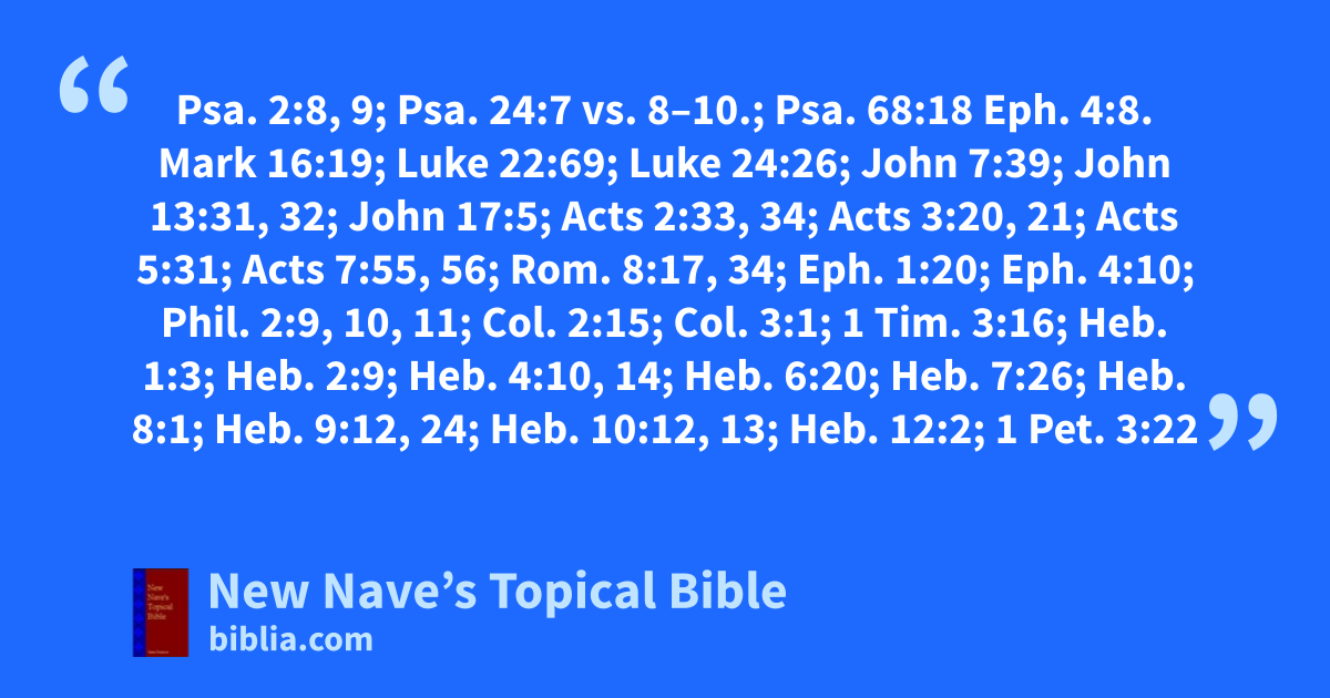 Exaltation of: Psa. 2:8, 9; Psa. 24:7 vs. 8–10.; Psa. 68:18 Eph. 4:8. Mark 16:19; Luke 22:69; Luke 24:26; John 7:39; John 13:31, 32; John 17:5; Acts 2:33, 34; Acts 3:20, 21; Acts 5:31; Acts 7:55, 56; Rom. 8:17, 34; Eph. 1:20; Eph. 4:10; Phil. 2:9, 10, 11; Col. 2:15; Col. 3:1; 1 Tim. 3:16; Heb. 1:3; Heb. 2:9; Heb. 4:10, 14; Heb. 6:20; Heb. 7:26; Heb. 8:1; Heb. 9:12, 24; Heb. 10:12, 13; Heb. 12:2; 1 Pet. 3:22