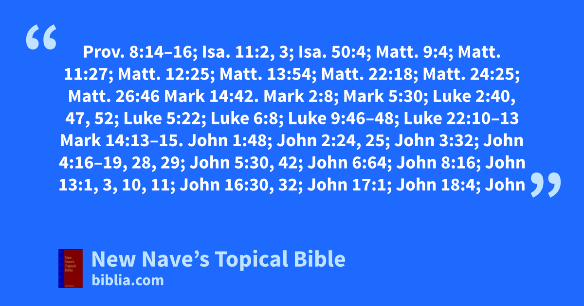 Omniscience of: Prov. 8:14–16; Isa. 11:2, 3; Isa. 50:4; Matt. 9:4; Matt. 11:27; Matt. 12:25; Matt. 13:54; Matt. 22:18; Matt. 24:25; Matt. 26:46 Mark 14:42. Mark 2:8; Mark 5:30; Luke 2:40, 47, 52; Luke 5:22; Luke 6:8; Luke 9:46–48; Luke 22:10–13 Mark 14:13–15. John 1:48; John 2:24, 25; John 3:32; John 4:16–19, 28, 29; John 5:30, 42; John 6:64; John 8:16; John 13:1, 3, 10, 11; John 16:30, 32; John 17:1; John 18:4; John 21:17; Acts 1:24; Col. 2:3; Rev. 2:18, 23; Rev. 5:5, 12