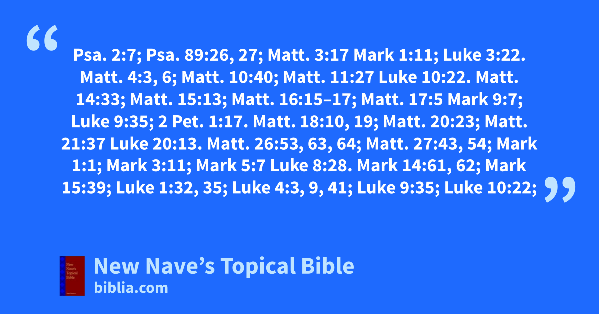 Son of God: Psa. 2:7; Psa. 89:26, 27; Matt. 3:17 Mark 1:11; Luke 3:22. Matt. 4:3, 6; Matt. 10:40; Matt. 11:27 Luke 10:22. Matt. 14:33; Matt. 15:13; Matt. 16:15–17; Matt. 17:5 Mark 9:7; Luke 9:35; 2 Pet. 1:17. Matt. 18:10, 19; Matt. 20:23; Matt. 21:37 Luke 20:13. Matt. 26:53, 63, 64; Matt. 27:43, 54; Mark 1:1; Mark 3:11; Mark 5:7 Luke 8:28. Mark 14:61, 62; Mark 15:39; Luke 1:32, 35; Luke 4:3, 9, 41; Luke 9:35; Luke 10:22; Luke 22:29, 70 Mark 14:61. John 1:1, 2, 14, 18, 34, 49, 50; John 3:16–18, 34–36; John 5:19–21, 23, 26, 27, 30, 32, 36, 37; John 6:27, 38, 40, 46, 57, 69; John 7:16, 28, 29; John 8:16, 19, 26–29, 38, 40, 42, 49, 54; John 9:35–37; John 10:15, 17, 18, 29, 30, 36–38; John 11:4, 27, 41; John 12:49, 50; John 13:3; John 14:7, 9–11, 13, 16, 20, 24, 28, 31; John 15:1, 8–10, 23, 24; John 16:5, 15, 27, 28, 32; John 17:1 vs. 1–26.; John 19:7; John 20:17, 21, 31; Acts 3:13; Acts 13:33; Rom. 1:3, 4, 9; Rom. 8:3, 29, 32; 1 Cor. 1:9; 1 Cor. 15:24, 27, 28; 2 Cor. 1:3, 19; Gal. 1:16; Gal. 4:4; Eph. 1:3; Eph. 3:14; Col. 1:3, 15, 19; Col. 3:17; 1 Thess. 1:10; Heb. 1:1–3, 5; Heb. 4:14; Heb. 5:5, 8, 10; Heb. 6:6; Heb. 7:3; Heb. 10:29; 1 John 1:7; 1 John 2:22–24; 1 John 3:8, 23; 1 John 4:9, 10, 14; 1 John 5:5, 9, 10, 13, 20; 2 John 3; Rev. 2:18 See Divinity of, Relation of, to the Father.