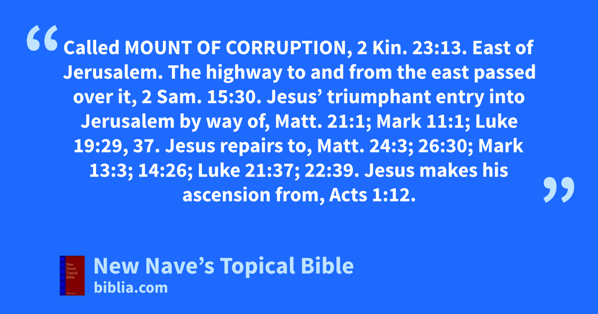 Mount of. Called Mount of Corruption, 2 Kin. 23:13. East of Jerusalem. The highway to and from the east passed over it, 2 Sam. 15:30. Jesus’ triumphant entry into Jerusalem by way of, Matt. 21:1; Mark 11:1; Luke 19:29, 37. Jesus repairs to, Matt. 24:3; 26:30; Mark 13:3; 14:26; Luke 21:37; 22:39. Jesus makes his ascension from, Acts 1:12.