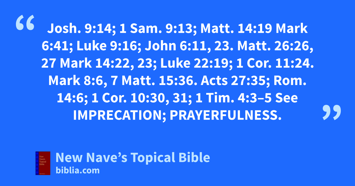 Thanksgiving Before Taking Food: Josh. 9:14; 1 Sam. 9:13; Matt. 14:19 Mark 6:41; Luke 9:16; John 6:11, 23. Matt. 26:26, 27 Mark 14:22, 23; Luke 22:19; 1 Cor. 11:24. Mark 8:6, 7 Matt. 15:36. Acts 27:35; Rom. 14:6; 1 Cor. 10:30, 31; 1 Tim. 4:3–5 See Imprecation; Prayerfulness.