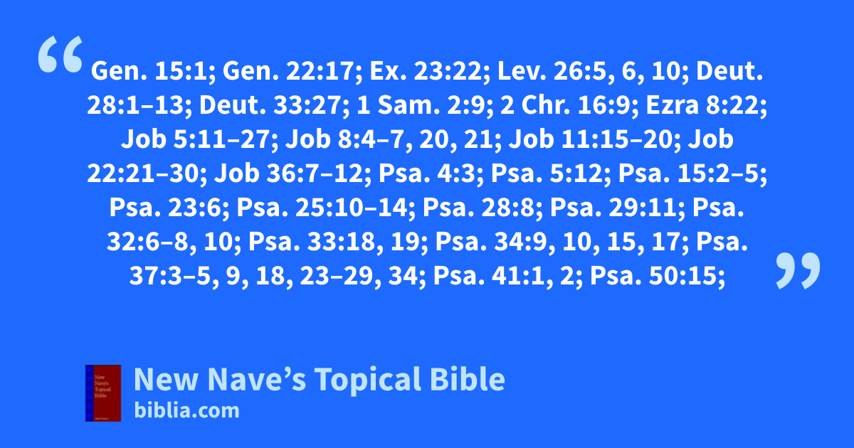Promises to, Expressed or Implied: Gen. 15:1; Gen. 22:17; Ex. 23:22; Lev. 26:5, 6, 10; Deut. 28:1–13; Deut. 33:27; 1 Sam. 2:9; 2 Chr. 16:9; Ezra 8:22; Job 5:11–27; Job 8:4–7, 20, 21; Job 11:15–20; Job 22:21–30; Job 36:7–12; Psa. 4:3; Psa. 5:12; Psa. 15:2–5; Psa. 23:6; Psa. 25:10–14; Psa. 28:8; Psa. 29:11; Psa. 32:6–8, 10; Psa. 33:18, 19; Psa. 34:9, 10, 15, 17; Psa. 37:3–5, 9, 18, 23–29, 34; Psa. 41:1, 2; Psa. 50:15; Psa. 55:22; Psa. 58:11; Psa. 62:8; Psa. 65:4; Psa. 73:24; Psa. 81:10; Psa. 84:11; Psa. 85:9; Psa. 91:1, 3–7, 9–12; Psa. 94:17, 18; Psa. 97:10, 11; Psa. 111:5; Psa. 112:6; Psa. 121:3–8; Psa. 125:1–3; Psa. 128:1–6; Psa. 145:18–21; Prov. 1:33; Prov. 2:21; Prov. 3:1–10, 25, 26; Prov. 10:3; Prov. 12:2; Prov. 14:26; Prov. 15:29; Prov. 16:7; Prov. 21:21; Prov. 28:25; Prov. 29:25; Eccl. 7:18; Eccl. 8:5; Isa. 4:5, 6; Isa. 11:6–9; Isa. 25:8; Isa. 26:3; Isa. 33:16, 21, 22, 24; Isa. 35:10; Isa. 40:10, 11, 29, 31; Isa. 41:10, 11, 13; Isa. 43:2; Isa. 44:2, 3; Isa. 49:9–12; Isa. 50:7–9; Isa. 51:11; Isa. 54:14, 17 vs. 1–16.; Isa. 56:2–8; Isa. 57:1, 2; Isa. 58:8–14; Isa. 59:20, 21; Isa. 64:4; Isa. 65:13, 14, 17–25; Isa. 66:13, 14; Jer. 17:7, 8; Ezek. 18:5–9, 19, 20; Ezek. 34:11–17, 22–31; Dan. 12:1–3; Hos. 6:3; Nah. 1:7; Hag. 1:13; Hag. 2:4, 5; Zech. 3:7; Mal. 3:16–18; Mal. 4:2, 3; Matt. 5:3–12; Matt. 7:7, 8 Luke 11:9, 10. Matt. 8:11; Matt. 10:28–32; Matt. 13:43; Matt. 18:10, 19, 20; Matt. 24:21, 22; Matt. 25:21 Luke 19:16–21. Matt. 25:33, 34, 46; Matt. 28:20; Mark 3:35; Mark 8:35; Mark 9:41; Mark 10:21, 29 [Matt. 19:29.] Mark 10:30; Mark 11:23, 24; Mark 13:13, 27; Luke 3:17 Matt. 3:12. Luke 6:20–23 Matt. 5:3–12. Luke 10:20; Luke 12:7, 32; Luke 16:22–25; Luke 18:29, 30; Luke 20:35, 36; Luke 21:18, 27, 28; Luke 22:29, 30; Luke 23:43; John 3:15–18, 36; John 4:14; John 5:24, 29; John 6:39, 40; John 8:12, 51; John 9:31; John 10:27–29; John 12:25, 26; John 13:36; John 14:1–3, 12–21, 23; John 16:33; John 17:2, 22, 24; Acts 10:4, 31; Acts 20:32; Acts 26:18; Rom. 2:7, 10; Rom. 5:9–11, 17; Rom. 6:22, 23; Rom. 8:14–18, 28, 32–39; Rom. 9:33; Rom. 10:9, 11–13; Rom. 13:11; 1 Cor. 1:8, 9; 1 Cor. 2:9; 1 Cor. 3:21–23; 1 Cor. 6:2, 3; 1 Cor. 8:3; 1 Cor. 13:10–12; 1 Cor. 15:48–57; 2 Cor. 1:20–22; 2 Cor. 4:14, 15, 17; 2 Cor. 7:1; Gal. 3:29; Gal. 6:8, 9; Eph. 1:18; Eph. 2:7; Eph. 6:8; Phil. 4:7, 19; Col. 1:5, 12; Col. 3:4, 24; 1 Thess. 2:12; 1 Thess. 3:12, 13; 1 Thess. 4:15–18; 1 Thess. 5:9–11; 2 Thess. 1:5–7; 2 Thess. 2:13, 14; 1 Tim. 1:16; 1 Tim. 4:8; 2 Tim. 1:12; 2 Tim. 2:10–12, 19; 2 Tim. 4:8; Tit. 2:11–14; Tit. 3:7; Heb. 1:14; Heb. 2:10, 15; Heb. 4:9, 15, 16; Heb. 6:10, 16–20; Heb. 9:15, 28; Heb. 10:34–36; Heb. 11:16; Heb. 12:22, 23, 28; Heb. 13:5, 6; Jas. 1:5, 12, 25; Jas. 2:5; Jas. 4:8; 1 Pet. 1:2–5; 1 Pet. 2:5, 6, 9, 10; 1 Pet. 3:9–12; 1 Pet. 4:13; 1 Pet. 5:4, 6, 7, 10; 2 Pet. 1:4, 10, 11; 2 Pet. 2:9; 1 John 1:7, 9; 1 John 2:17, 25, 28; 1 John 3:2, 22; 1 John 5:13; Rev. 1:6; Rev. 2:7, 10, 11, 17, 26–28; Rev. 3:4, 5, 10, 12, 21; Rev. 7:3, 4, 9–17; Rev. 11:12, 18; Rev. 14:1–5, 13; Rev. 16:15; Rev. 20:4–6; Rev. 21:3–7, 24; Rev. 22:4, 5, 7, 12, 14 See Adoption; Afflictions and Adversities, Consolation in; God, Preserver; God, Providence of. For promises in particular, see Backslider; Obedience; Repentant Ones, Promises to, etc., under such topics as may be desired.