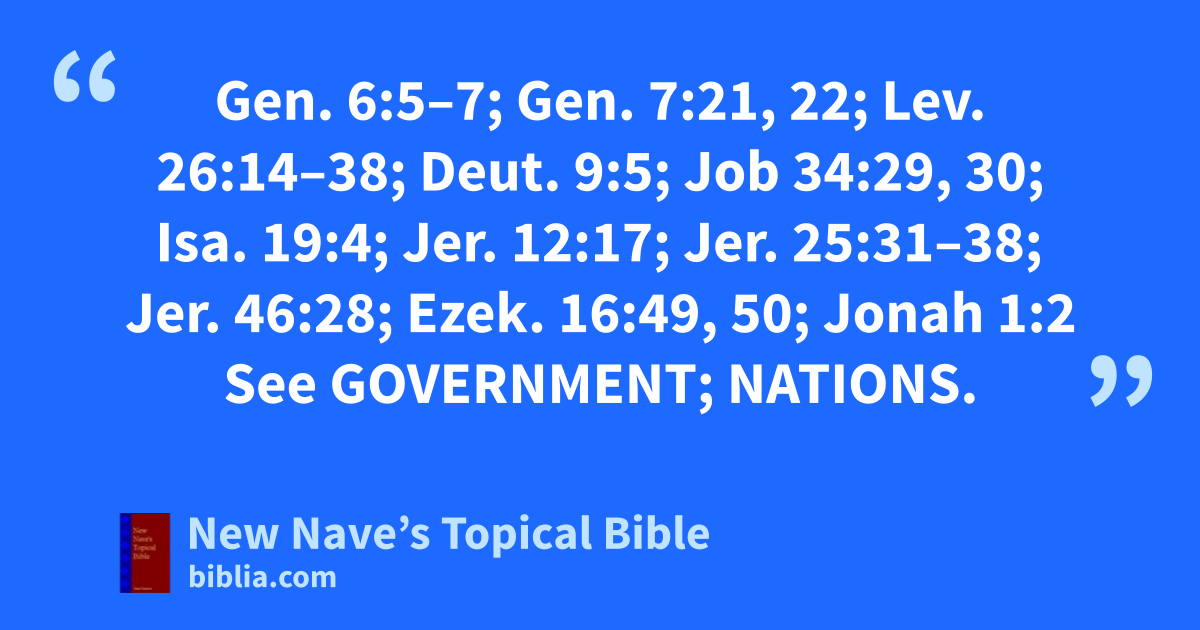 National, Punishment of: Gen. 6:5–7; Gen. 7:21, 22; Lev. 26:14–38; Deut. 9:5; Job 34:29, 30; Isa. 19:4; Jer. 12:17; Jer. 25:31–38; Jer. 46:28; Ezek. 16:49, 50; Jonah 1:2 See Government; Nations.