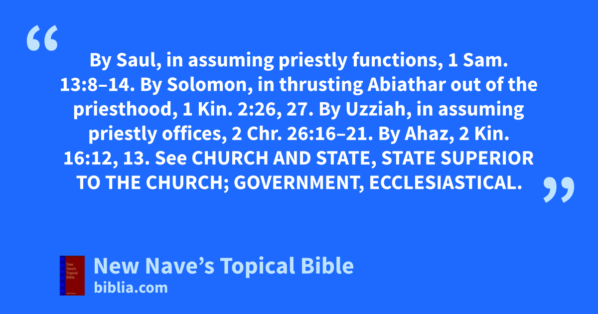 In Ecclesiastical Affairs: By Saul, in assuming priestly functions, 1 Sam. 13:8–14. By Solomon, in thrusting Abiathar out of the priesthood, 1 Kin. 2:26, 27. By Uzziah, in assuming priestly offices, 2 Chr. 26:16–21. By Ahaz, 2 Kin. 16:12, 13. See Church and State, State Superior to the Church; Government, Ecclesiastical.