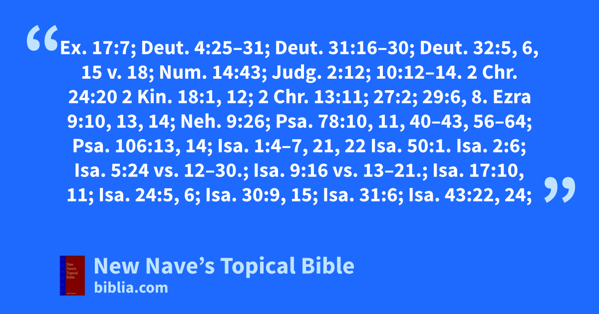 Backsliding of Israel: Ex. 17:7; Deut. 4:25–31; Deut. 31:16–30; Deut. 32:5, 6, 15 v. 18; Num. 14:43; Judg. 2:12; 10:12–14. 2 Chr. 24:20 2 Kin. 18:1, 12; 2 Chr. 13:11; 27:2; 29:6, 8. Ezra 9:10, 13, 14; Neh. 9:26; Psa. 78:10, 11, 40–43, 56–64; Psa. 106:13, 14; Isa. 1:4–7, 21, 22 Isa. 50:1. Isa. 2:6; Isa. 5:24 vs. 12–30.; Isa. 9:16 vs. 13–21.; Isa. 17:10, 11; Isa. 24:5, 6; Isa. 30:9, 15; Isa. 31:6; Isa. 43:22, 24; Isa. 51:17 vs. 18–20.; Isa. 63:17; Isa. 65:2, 3; Jer. 2:5, 11–13, 17, 19, 21, 27, 31, 32; Jer. 3:21 vs. 1–25.; Jer. 5:19, 23 vs. 1–31; Jer. 11:9–17. Jer. 6:30 Ezek. 22:18. Jer. 7:12 vs. 13–34.; Jer. 8:5, 14, 15 vs. 1–22.; Jer. 10:20, 21 vs. 17–22.; Jer. 12:7; Jer. 13:24, 25; Jer. 14:7, 10; Jer. 15:1 vs. 2–14.; Jer. 18:13–15 Jer. 19. Jer. 32:31 v. 30.; Jer. 50:6; Ezek. 2:3–8; Ezek. 5:6 vs. 1–17.; Ezek. 11:21 vs. 1–21. [See Parable of the Vine, Ezek. 15.]Ezek. 16:43 [See Parables of an Unfaithful Wife, Ezek. 16; 23; Hos. 2; 3.]Hos. 1:6, 9 vs. 1–9.; Hos 4:6, 10 v. 16.; Hos. 5:11, 12 vs. 1–15.; Hos. 6:4, 7 vs. 4–11; Hos. 8:14; 9:1–17; 13:16. Hos. 11:2, 7; Hos. 14:1; Amos 2:4; Zeph. 1:6; Mal. 1:6; Mal. 3:7; Heb. 3:16–18