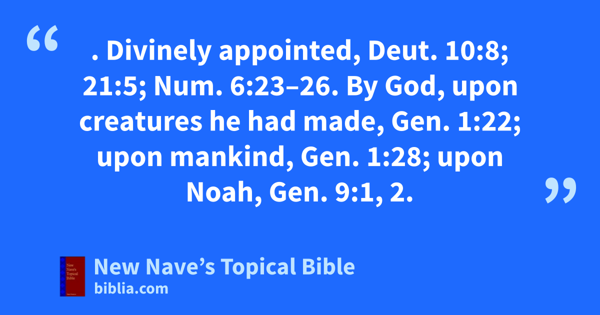 BENEDICTIONS. Divinely appointed, Deut. 10:8; 21:5; Num. 6:23–26. By God, upon creatures he had made, Gen. 1:22; upon mankind, Gen. 1:28; upon Noah, Gen. 9:1, 2.