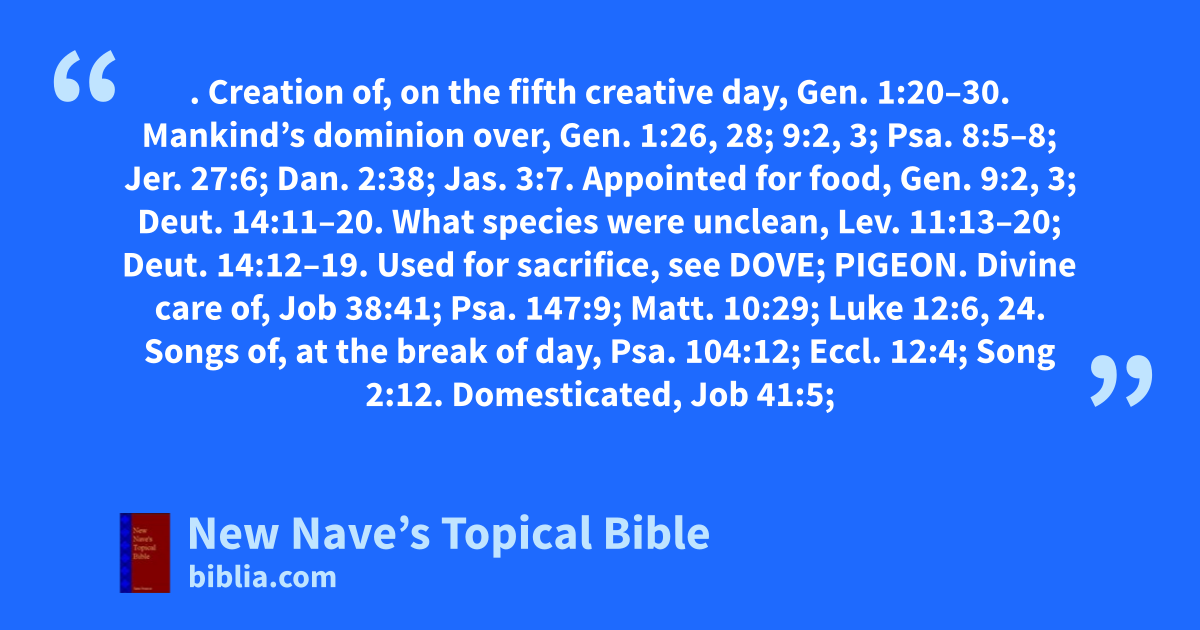 BIRDS. Creation of, on the fifth creative day, Gen. 1:20–30. Mankind’s dominion over, Gen. 1:26, 28; 9:2, 3; Psa. 8:5–8; Jer. 27:6; Dan. 2:38; Jas. 3:7. Appointed for food, Gen. 9:2, 3; Deut. 14:11–20. What species were unclean, Lev. 11:13–20; Deut. 14:12–19. Used for sacrifice, see Dove; Pigeon. Divine care of, Job 38:41; Psa. 147:9; Matt. 10:29; Luke 12:6, 24. Songs of, at the break of day, Psa. 104:12; Eccl. 12:4; Song 2:12. Domesticated, Job 41:5; Jas. 3:7. Solomon’s proverbs of, 1 Kin. 4:33. Nests of, Psa. 104:17; Matt. 8:20; 13:32. Instincts of, Prov. 1:17. Habits of, Job 39:13–18, 26–30. Migrate, Jer. 8:7. Mosaic law protected the mother from being taken with the young, Deut. 22:6, 7. Cages of, Jer. 5:27; Rev. 18:2. See Instinct; Snares.