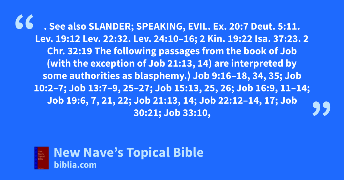 BLASPHEMY. See also Slander; Speaking, Evil. Ex. 20:7 Deut. 5:11. Lev. 19:12 Lev. 22:32. Lev. 24:10–16; 2 Kin. 19:22 Isa. 37:23. 2 Chr. 32:19 The following passages from the book of Job (with the exception of Job 21:13, 14) are interpreted by some authorities as blasphemy.) Job 9:16–18, 34, 35; Job 10:2–7; Job 13:7–9, 25–27; Job 15:13, 25, 26; Job 16:9, 11–14; Job 19:6, 7, 21, 22; Job 21:13, 14; Job 22:12–14, 17; Job 30:21; Job 33:10, 11; Job 34:5, 6, 9, 16–19, 37; Job 37:20; Job 40:2; Psa. 10:11, 13; Psa. 50:21; Psa. 73:9, 11; Psa. 74:18; Psa. 78:19, 20; Psa. 94:7; Psa. 139:20; Prov. 30:8, 9 v. 7.; Isa. 8:21, 22; Isa. 29:15, 16; Isa. 36:15, 18, 20, 21; Isa. 37:10; Isa. 40:27; Isa. 45:9; Isa. 52:5; Isa. 65:7; Jer. 4:10; Jer. 17:15; Jer. 20:7; Jer. 23:10; Ezek. 8:12; Ezek. 9:9; Ezek. 18:25; Ezek. 20:27; Ezek. 33:17–20; Ezek. 35:12, 13; Dan. 7:25; Dan. 11:36, 37; Hos. 7:13; Zeph. 1:12; Zech. 5:3, 4; Mal. 3:13, 14; Matt. 10:25; Matt. 12:31, 32 Mark 3:29, 30; Luke 12:10. Matt. 15:19; Mark 7:21–23; John 19:7; Rom. 2:24 2 Sam. 12:14. 1 Cor. 12:3; Col. 3:8; 2 Thess. 2:4; 2 Tim. 3:2 Rev. 16:11; Heb. 10:29; Jas. 2:7; Jas. 3:10; Jas. 5:12; 2 Pet. 3:3, 4; Rev. 13:1, 6; Rev. 16:9, 21; Rev. 17:3 Prophecy of, Rev. 13:1, 5, 6; 16:9, 11, 21; 17:3.