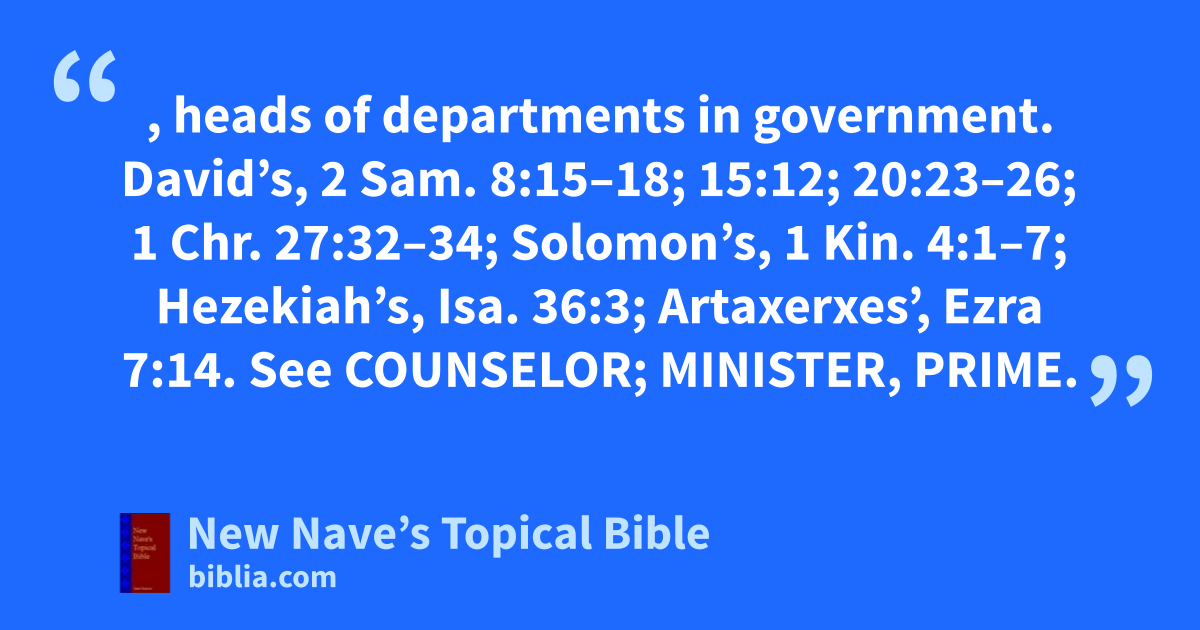 CABINET, heads of departments in government. David’s, 2 Sam. 8:15–18; 15:12; 20:23–26; 1 Chr. 27:32–34; Solomon’s, 1 Kin. 4:1–7; Hezekiah’s, Isa. 36:3; Artaxerxes’, Ezra 7:14. See Counselor; Minister, Prime.