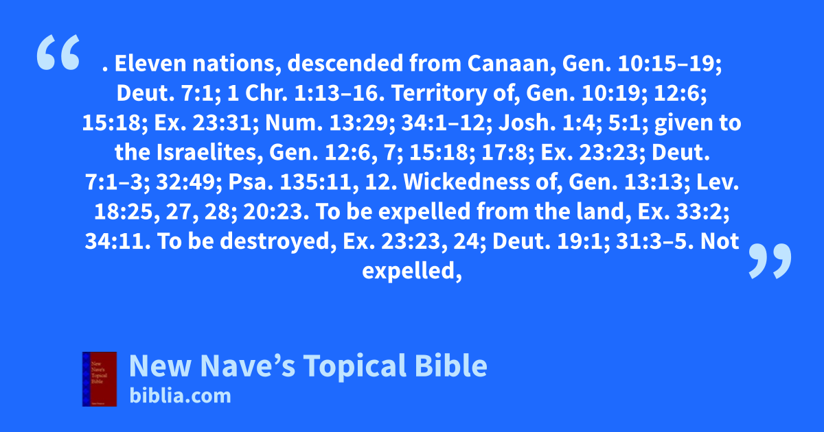 CANAANITES. Eleven nations, descended from Canaan, Gen. 10:15–19; Deut. 7:1; 1 Chr. 1:13–16. Territory of, Gen. 10:19; 12:6; 15:18; Ex. 23:31; Num. 13:29; 34:1–12; Josh. 1:4; 5:1; given to the Israelites, Gen. 12:6, 7; 15:18; 17:8; Ex. 23:23; Deut. 7:1–3; 32:49; Psa. 135:11, 12. Wickedness of, Gen. 13:13; Lev. 18:25, 27, 28; 20:23. To be expelled from the land, Ex. 33:2; 34:11. To be destroyed, Ex. 23:23, 24; Deut. 19:1; 31:3–5. Not expelled, Josh. 17:12–18; Judg. 1:1–33; 3:1–3. Defeat the Israelites, Num. 14:45; Judg. 4:1–3. Defeated by the Israelites, Num. 21:1–3; Josh. 11:1–16; Judg. 4:4–24; by the Egyptians, 1 Kin. 9:16. Chariots of, Josh. 17:18. Isaac forbidden by Abraham to take a wife from, Gen. 38:2; 1 Chr. 2:3. The exile Jews take wives from, Ezra 9:2. Prophecy concerning, Gen. 9:25–27.