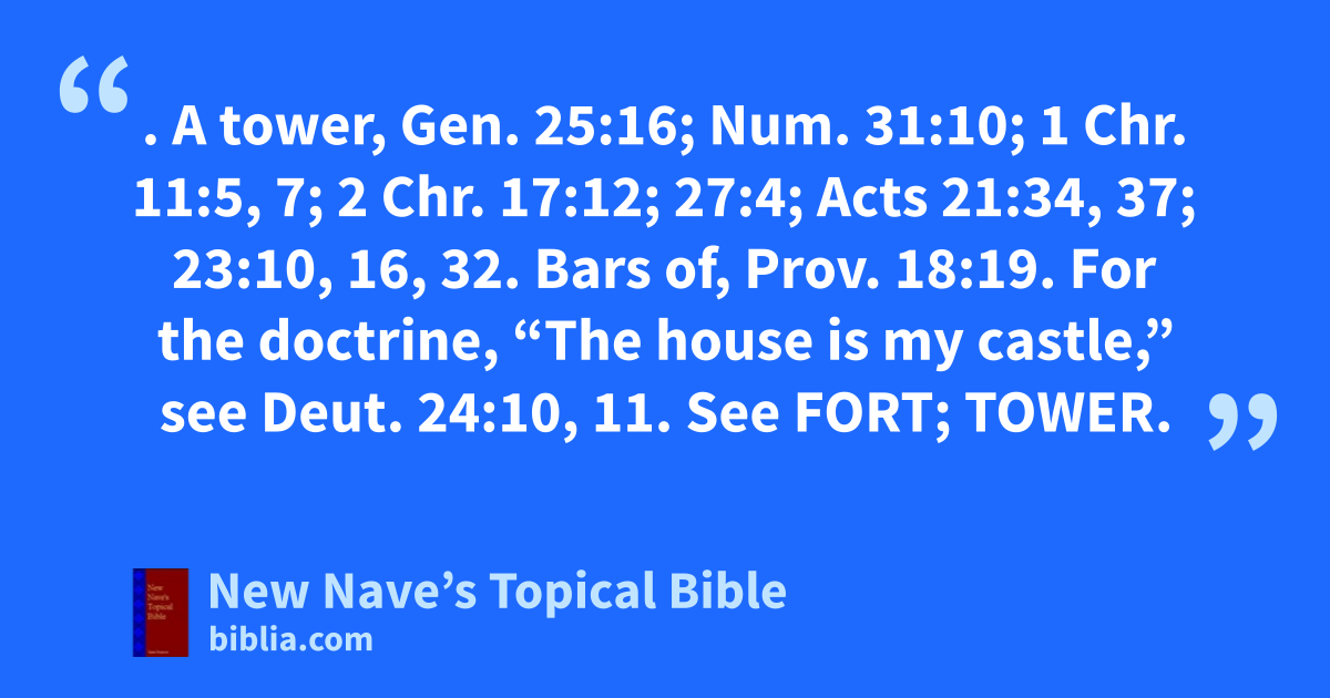CASTLE. A tower, Gen. 25:16; Num. 31:10; 1 Chr. 11:5, 7; 2 Chr. 17:12; 27:4; Acts 21:34, 37; 23:10, 16, 32. Bars of, Prov. 18:19. For the doctrine, “The house is my castle,” see Deut. 24:10, 11. See Fort; Tower.