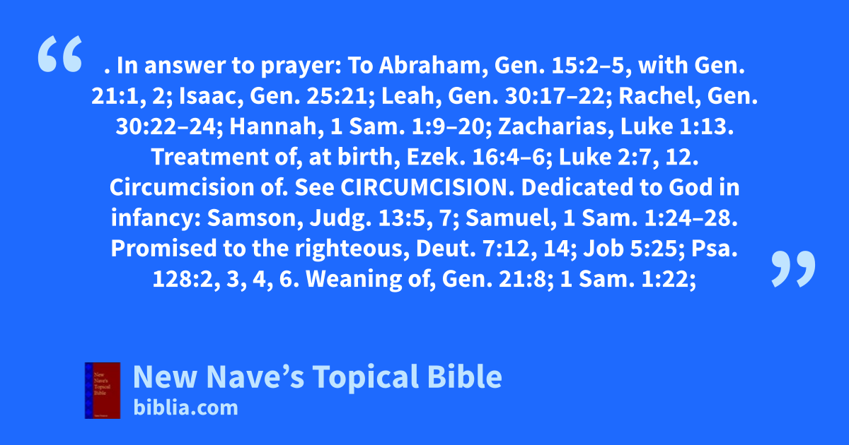 CHILDREN. In answer to prayer: To Abraham, Gen. 15:2–5, with Gen. 21:1, 2; Isaac, Gen. 25:21; Leah, Gen. 30:17–22; Rachel, Gen. 30:22–24; Hannah, 1 Sam. 1:9–20; Zacharias, Luke 1:13. Treatment of, at birth, Ezek. 16:4–6; Luke 2:7, 12. Circumcision of. See Circumcision. Dedicated to God in infancy: Samson, Judg. 13:5, 7; Samuel, 1 Sam. 1:24–28. Promised to the righteous, Deut. 7:12, 14; Job 5:25; Psa. 128:2, 3, 4, 6. Weaning of, Gen. 21:8; 1 Sam. 1:22; 1 Kin. 11:20; Psa. 131:2; Isa. 28:9. Nurses for, Ex. 2:7–9; Acts 7:20; Ruth 4:16; 2 Sam. 4:4; 2 Kin. 11:2. Taught to walk, Hos. 11:3. Tutors and governors for, 2 Kin. 10:1; Acts 22:3; Gal. 3:24; 4:1, 2. Illegitimate, excluded from the privileges of the congregation, Deut. 23:2; Heb. 12:8. Early piety of: Samuel, 1 Sam. 2:18; 3; Jeremiah, Jer. 1:5–7; John the Baptist, Luke 1:15, 80. Jesus, Luke 2:40, 46, 47, 52. Difference made between male and female, in Mosaic law, Lev. 12. Partiality of parents among: Rebekah for Jacob, Gen. 27:6–17; Jacob for Joseph, Gen. 37:3, 4. Partiality among, forbidden, Deut. 21:15–17. Love of, for parents: Of Ruth, Ruth 1:16–18; Jesus, John 19:26, 27. Sacrificed, 2 Kin. 17:31; Ezek. 16:20, 21. Caused to pass through fire, 2 Kin. 16:3; Jer. 32:35; Ezek. 16:21. Sold for debt, 2 Kin. 4:1; Neh. 5:5; Job 24:9; Matt. 18:25. Sold in marriage, law concerning, Ex. 21:7–11; instance of, Leah and Rachel, Gen. 29:15–30. Edict to murder: Of Pharaoh, Ex. 1:22; of Jehu, 2 Kin. 10:1–8; of Herod, Matt. 2:16–18. Eaten, see Cannibalism. Share benefits of covenant privileges guaranteed to parents, Gen. 6:18; 12:7; 13:15; 17:7, 8; 19:12; 21:13; 26:3–5, 24; Lev. 26:44, 45; Isa. 65:23; 1 Cor. 7:14. Bound by covenants of parents, Gen. 17:9–14. Involved in guilt of parents, Ex. 20:5; 34:7; Lev. 20:5; 26:39–42; Num. 14:18, 33; 1 Kin. 21:29; Job 21:19; Psa. 37:28; Isa. 14:20, 21; 65:6, 7; Jer. 32:18; Dan. 6:24. Not punished for parents’ sake, Jer. 31:29, 30; Ezek. 18:1–30. Death of, as a judgment upon parents: Firstborn of Egypt, Ex. 12:29; sons of Eli, 1 Sam. 3:13, 14; sons of Saul, 1 Sam. 28:18, 19; David’s child by Uriah’s wife, 2 Sam. 12:14–19. Miracles in behalf of: Raised from the dead by Elijah, 1 Kin. 17:17–23; by Elisha, 2 Kin. 4:17–36; by Jesus, Matt. 9:18, 24–26; Mark 5:35–42; Luke 7:13–15; 8:49–56; healing of, Matt. 15:28; 17:18; Mark 7:29, 30; 9:23–27; Luke 8:42–56; 9:38–42; John 4:46–54. Character of, known by conduct, Prov. 20:11. Blessed by Jesus, Matt. 19:13–15; Mark 10:13–16; Luke 18:15, 16. Future state of, Matt. 18:10; 19:14. Minors, Gal. 4:1, 2. Of ministers, 1 Tim. 3:4; Tit. 1:6. Alienated, Ishmael, to gratify Sarah, Gen. 21:9–15. Amusements of, Job 21:11; Zech. 8:5; Matt. 11:16, 17; Luke 7:31, 32. Adopted. See Adoption.
