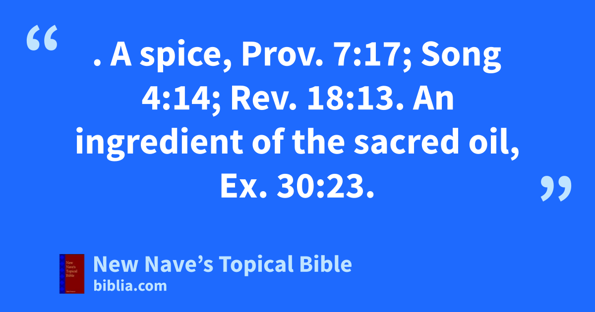 CINNAMON. A spice, Prov. 7:17; Song 4:14; Rev. 18:13. An ingredient of the sacred oil, Ex. 30:23.