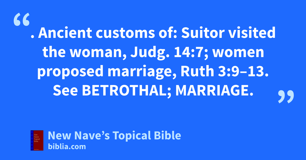 COURTSHIP. Ancient customs of: Suitor visited the woman, Judg. 14:7; women proposed marriage, Ruth 3:9–13. See Betrothal; Marriage.